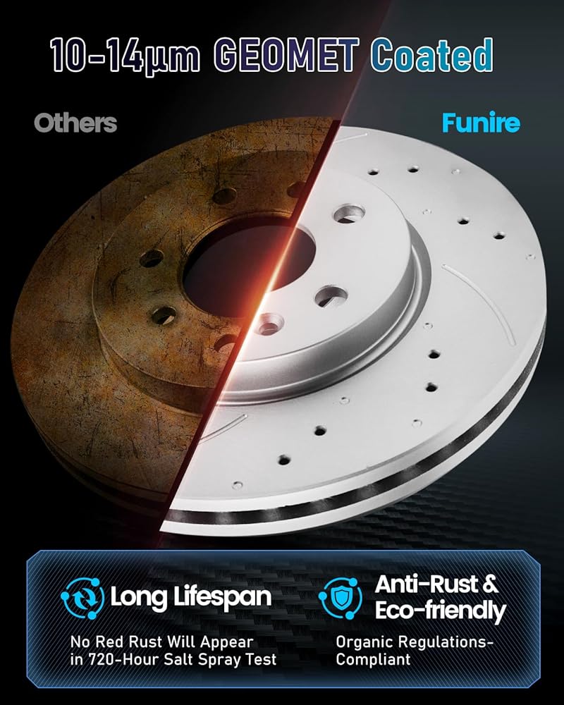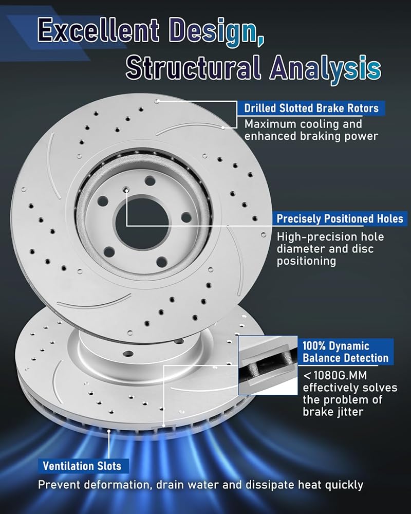 【تحسين الأداء】تتميز وسادات الفرامل ومجموعات الدوارات بأحدث التصميمات المثقوبة والمشقوقة. يعزز هذا التصميم بشكل كبير التهوية وتبديد الحرارة، ويقلل من تأثير الحرارة الزائدة على أداء فرامل السيارة، ويخلق تجربة فرملة أكثر هدوءًا وسلاسة في الوقت المناسب. ويمكن أن يزيد من عض وسادة الفرامل، ويطيل عمر خدمة وسادة الفرامل.