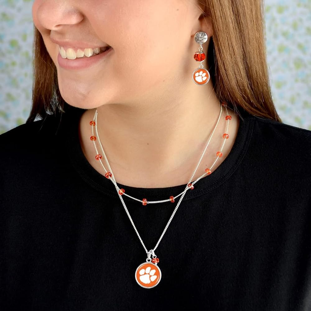 Each piece is Silver Tone and features a logo charm. The double necklace is 18" and 20" in length plus a 3" extender with a one inch logo charm. The stretch bracelet has a 5/8" logo charm, team color and silver beads and silver embellishments. The post earrings are 2" in length, lightweight and include a 5/8" logo charm, beads and silver embellishments. This is a beautiful modern jewelry combo set. Show your team pride! Great for yourself or as a gift!