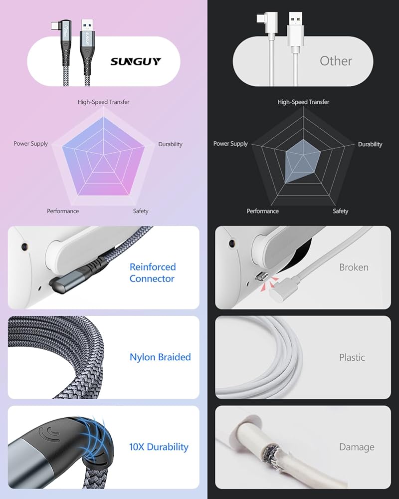 كابل SUNGUY Link بطول 20 قدم متوافق مع ملحقات Meta/Oculus Quest 3/2/Pico 4 وأجهزة الكمبيوتر/Steam VR، نقل بيانات الكمبيوتر عالي السرعة 5 جيجابت في الثانية، كابل USB 3.0 نوع C لسماعات الواقع الافتراضي، كمبيوتر الألعاب، Quest 3/2/1