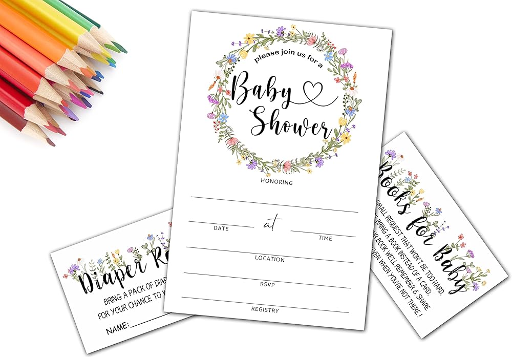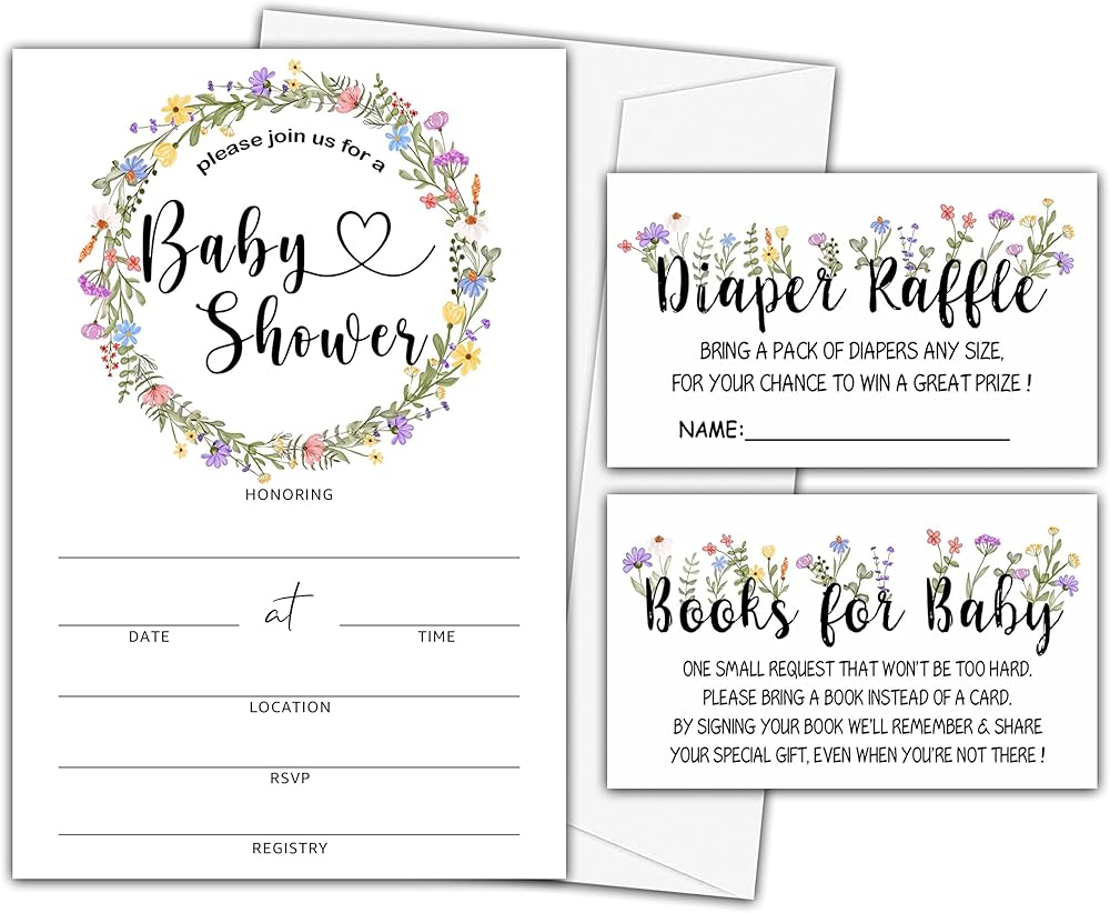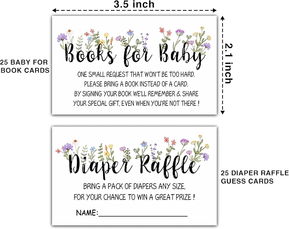 الحجم والعبوة: كل دعوات استحمام للأطفال مقاس 10.16 سم × 15.24 سم، كل بطاقات تخمين حفاضات وطفل للكتاب بمقاس 2.1 سم × 3.5 سم.