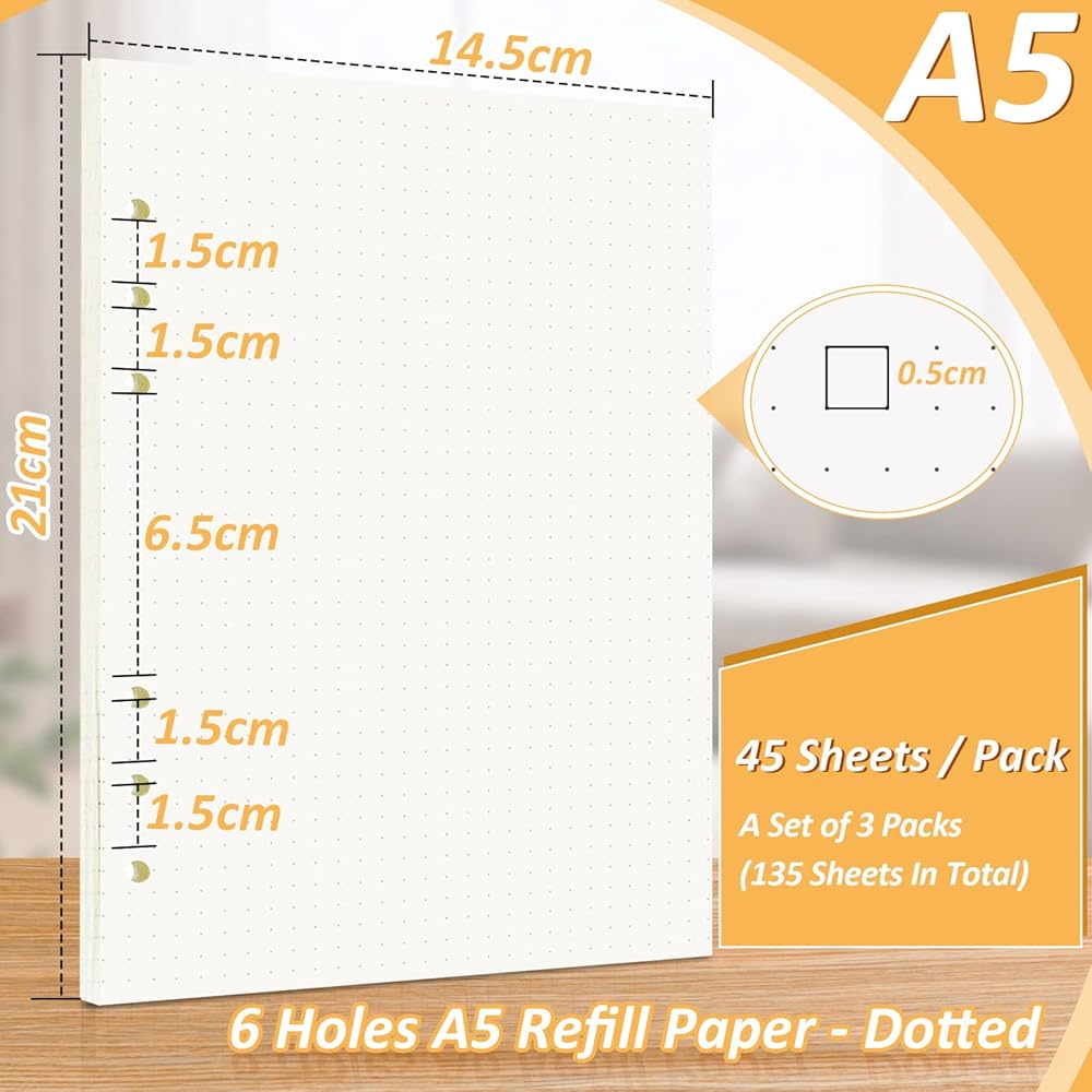 【تغليف عالي الجودة】: تحتوي كل عبوة من ورق A5 المنقط على 3 عبوات (135 ورقة، 270 صفحة). سعر معقول، كمية كبيرة، لا حاجة لإعادة الشراء بشكل متكرر. نحن نقدم لك ما يكفي من الورق القابل لإعادة التعبئة لملء ورق التجليد الخاص بك مقاس A5 لفترة طويلة. يحتوي كل منظم للمخطط القالب على 6 فتحات. يرجى التحقق من المسافة بين كل فتحة في الغلاف للتأكد من ملاءمتها بشكل صحيح. ليست رقيقة جدًا وليست صلبة جدًا، إنها الورقة المناسبة للكتابة.
