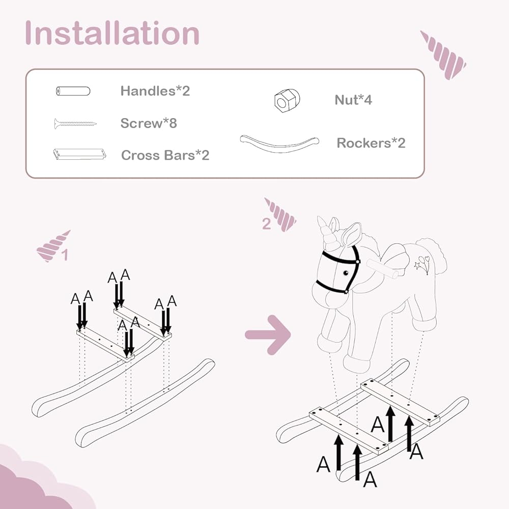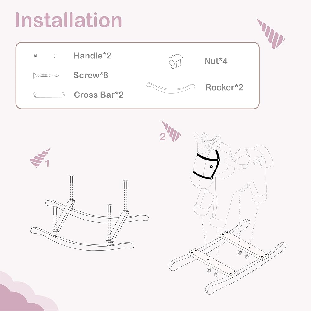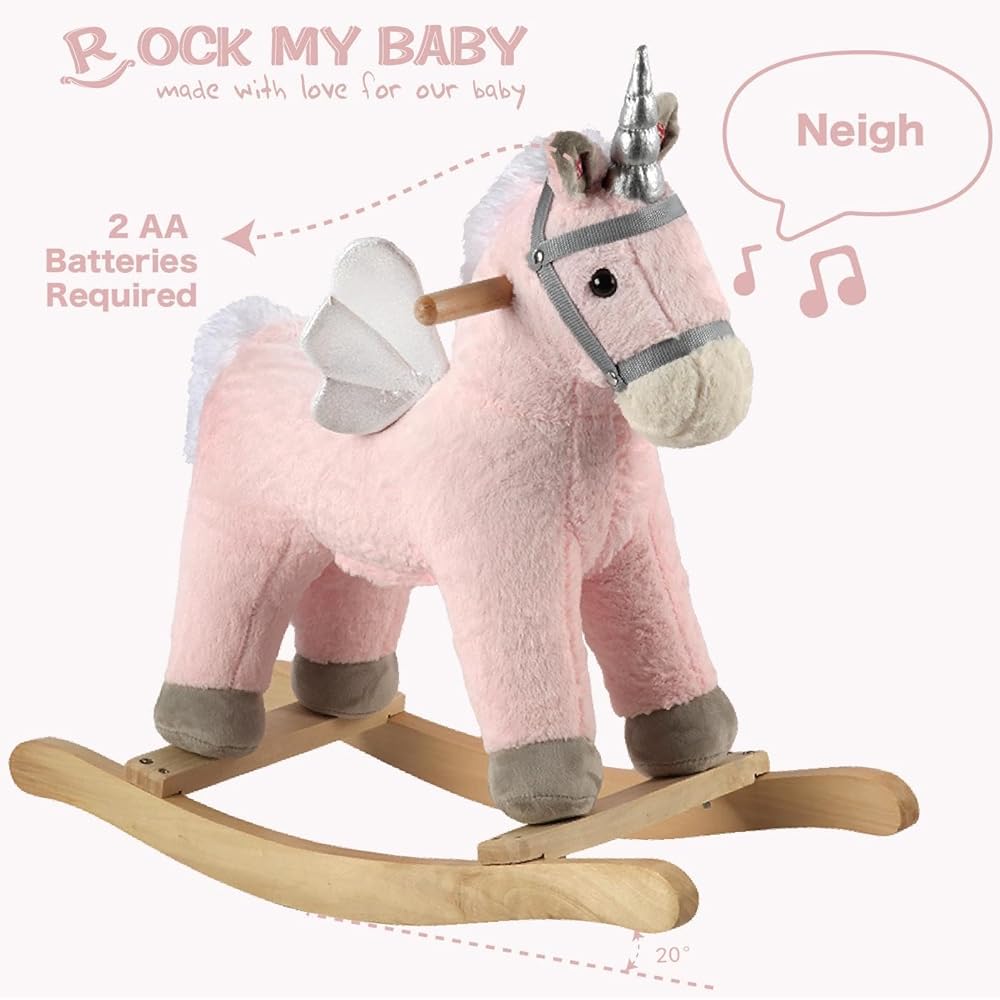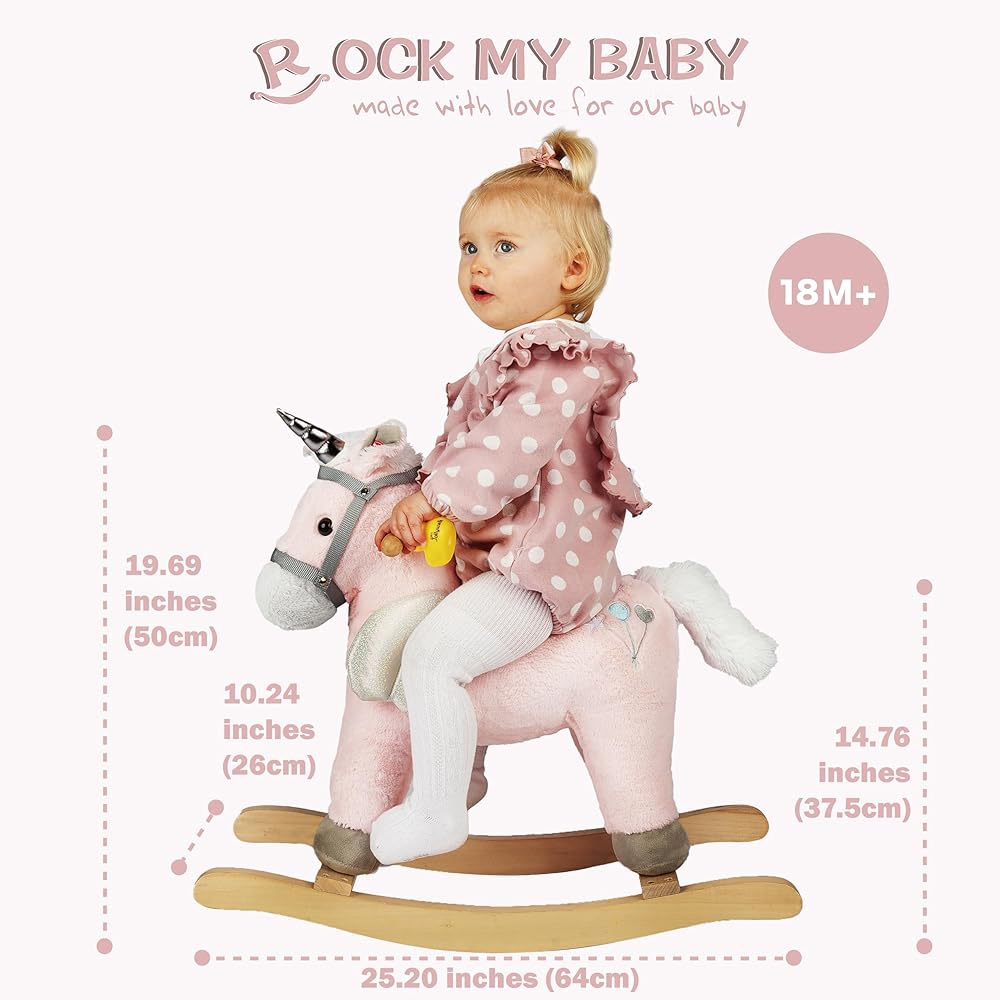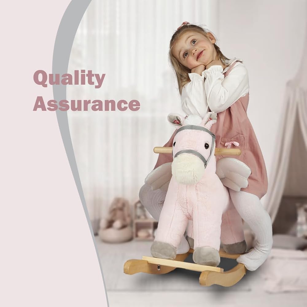 STURDY STRUCTURE AND SAFE MATERIAL. This rocking horse is made of very soft fabric and built with solid wood rails, strong metal structure and soft polyester filling inside it. All the materials are strict to the Toys Safety Standards ASTM F963 in USA and EN71/CE in Europe.