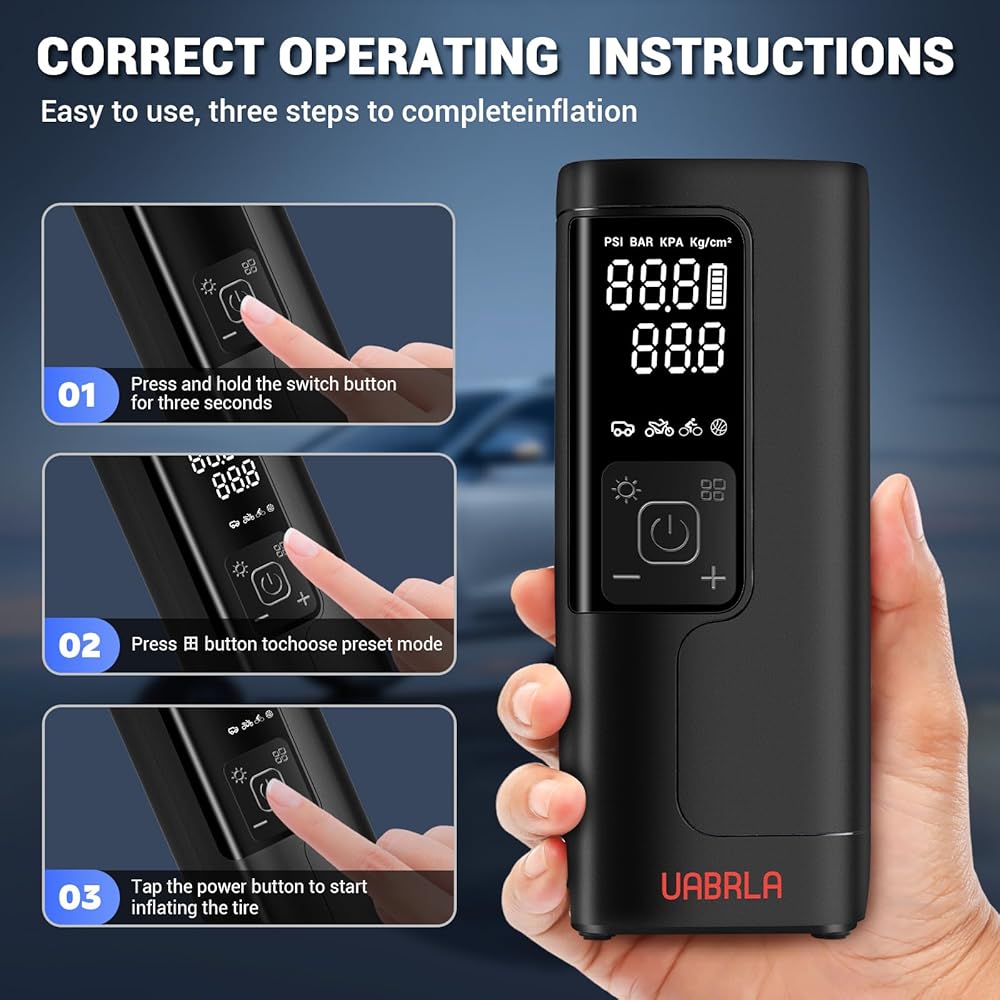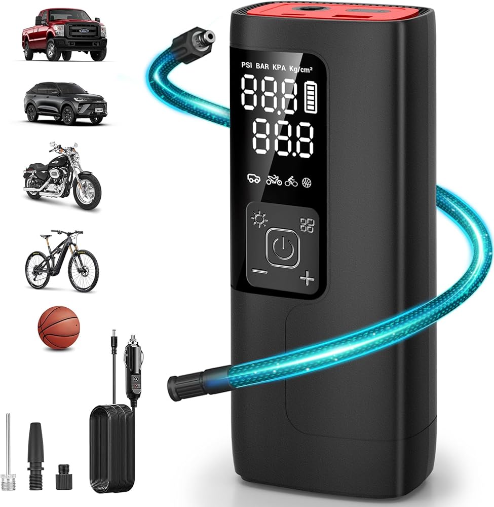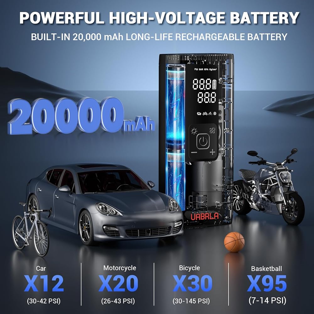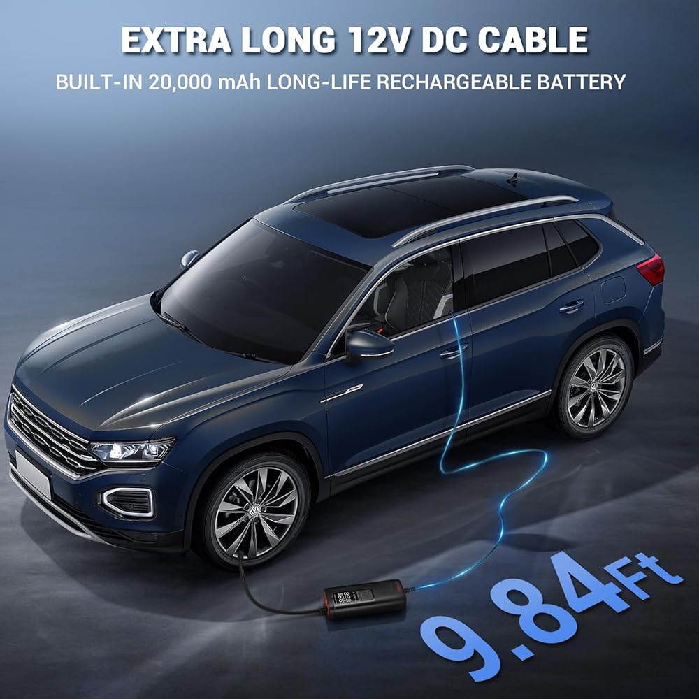 منفاخ الإطارات 2 في 1: منفاخ الإطارات المحمول للسيارة مجهز بإمدادات طاقة مزدوجة ويمكنه التبديل بين السلك اللاسلكي وسلك الطاقة في أي وقت. منفاخ الإطارات مزود ببطارية مدمجة قابلة لإعادة الشحن بقوة 20000 مللي أمبير في الساعة يمكنها نفخ السيارة مباشرة بعد الشحن الكامل. لا داعي للقلق بشأن نفاد البطارية على الطريق لأنها مجهزة بسلك طاقة تيار مستمر 12 فولت، ومصدر طاقة مستمر وموثوق. يجمع هذا المنفاخ المزدوج القوة بين ما يجعله رفيقًا لا غنى عنه في أي رحلة.