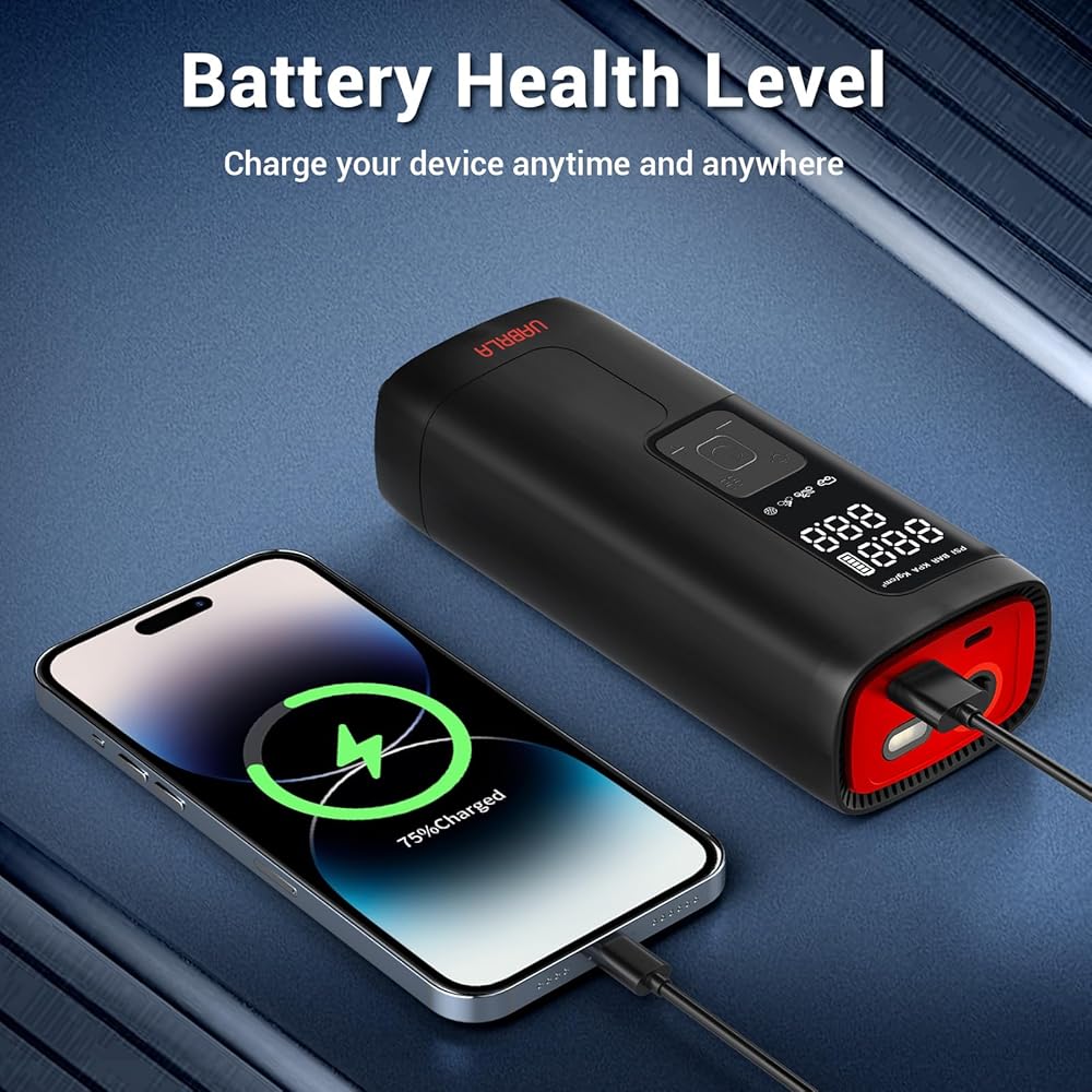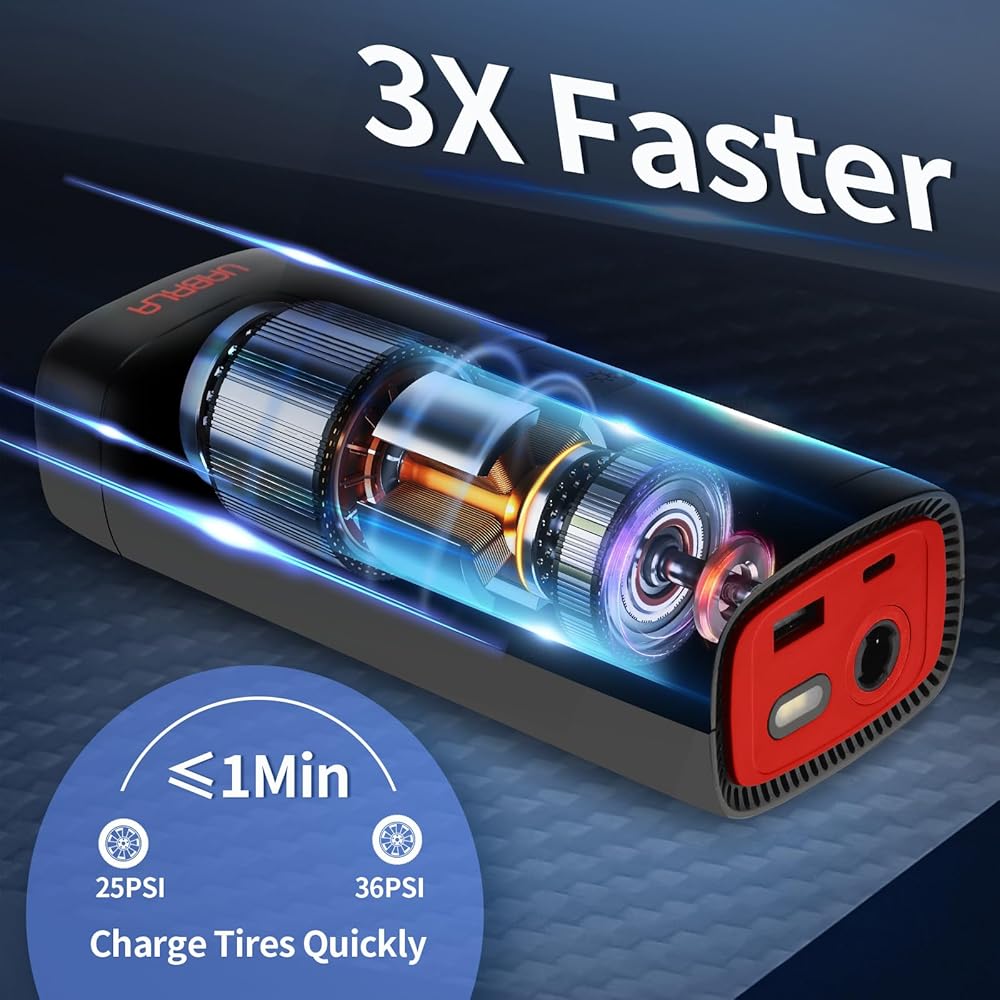 أكثر من مجرد منفاخ للإطارات: ضاغط الهواء للسيارة الخاص بنا هو أكثر من مجرد منفاخ للإطارات. إنها أيضًا أداة متعددة الاستخدامات تجمع بين منفاخ الإطارات وبنك الطاقة ومصباح العمل. إنه مثالي لسيناريوهات السفر والإنقاذ في الهواء الطلق، حيث يوفر دعم الشحن والإضاءة. رفيق أساسي لرحلة الطريق.