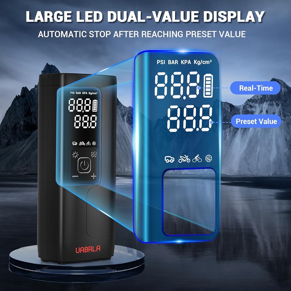 رقائق عالية الدقة: يتميز منفاخ الإطارات المحمول للسيارة بمقياس ضغط رقمي عالي الأداء لرؤية فورية لقيم الضغط في الوقت الحقيقي والضغط المسبق على شاشات LED المزدوجة. يمكنك التبديل بسهولة بين أربع وحدات (رطل لكل بوصة مربعة، كيلو باسكال، بار، كجم/سم²). يتم أيضًا إيقاف تشغيل منفاخ إطارات السيارة تلقائيًا عند الوصول إلى قيمة محددة مسبقًا، مما يمنع الشحن الزائد وتذكر آخر قيمة محددة مسبقًا لتجنب التشغيل المتكرر. منفاخ إطارات موثوق وسهل الاستخدام، ستشعر بالثقة في كل رحلة.