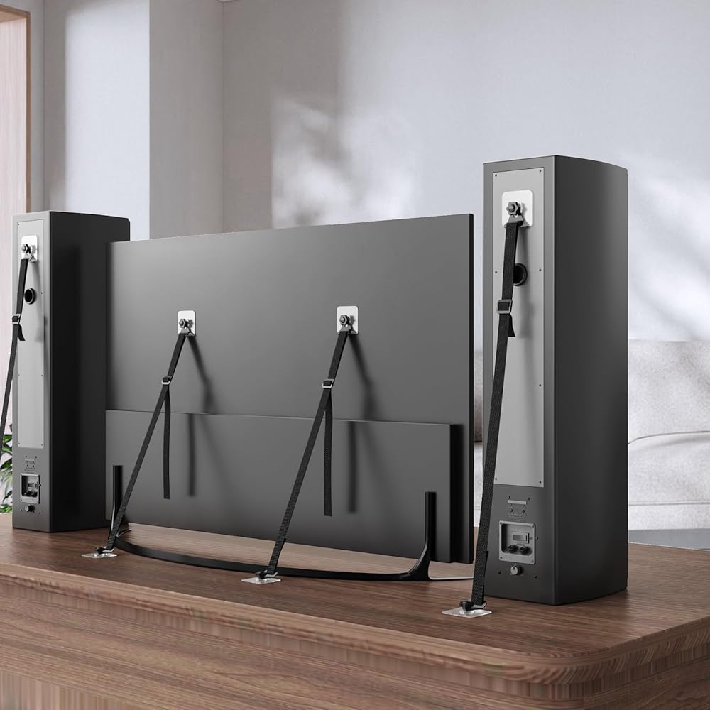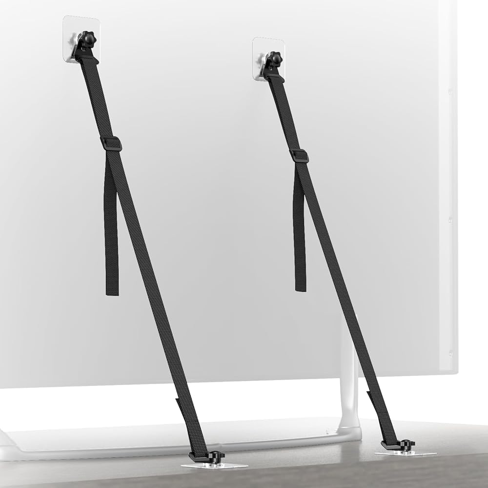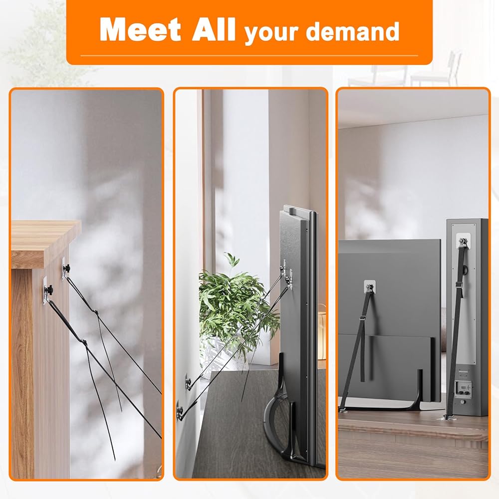 منع الانقلاب: يمكن ربط أحزمة أمان تلفزيون PUTORSEN مباشرة بالجزء الخلفي من التلفزيون أو استخدامها مع فتحات VESA (فتحات البراغي للتركيب على الحائط) الموجودة في الجزء الخلفي من التلفزيون لمنع التلفزيون أو الأثاث من الانقلاب للأمام. يحمي الأطفال والحيوانات الأليفة في حالات الطوارئ.