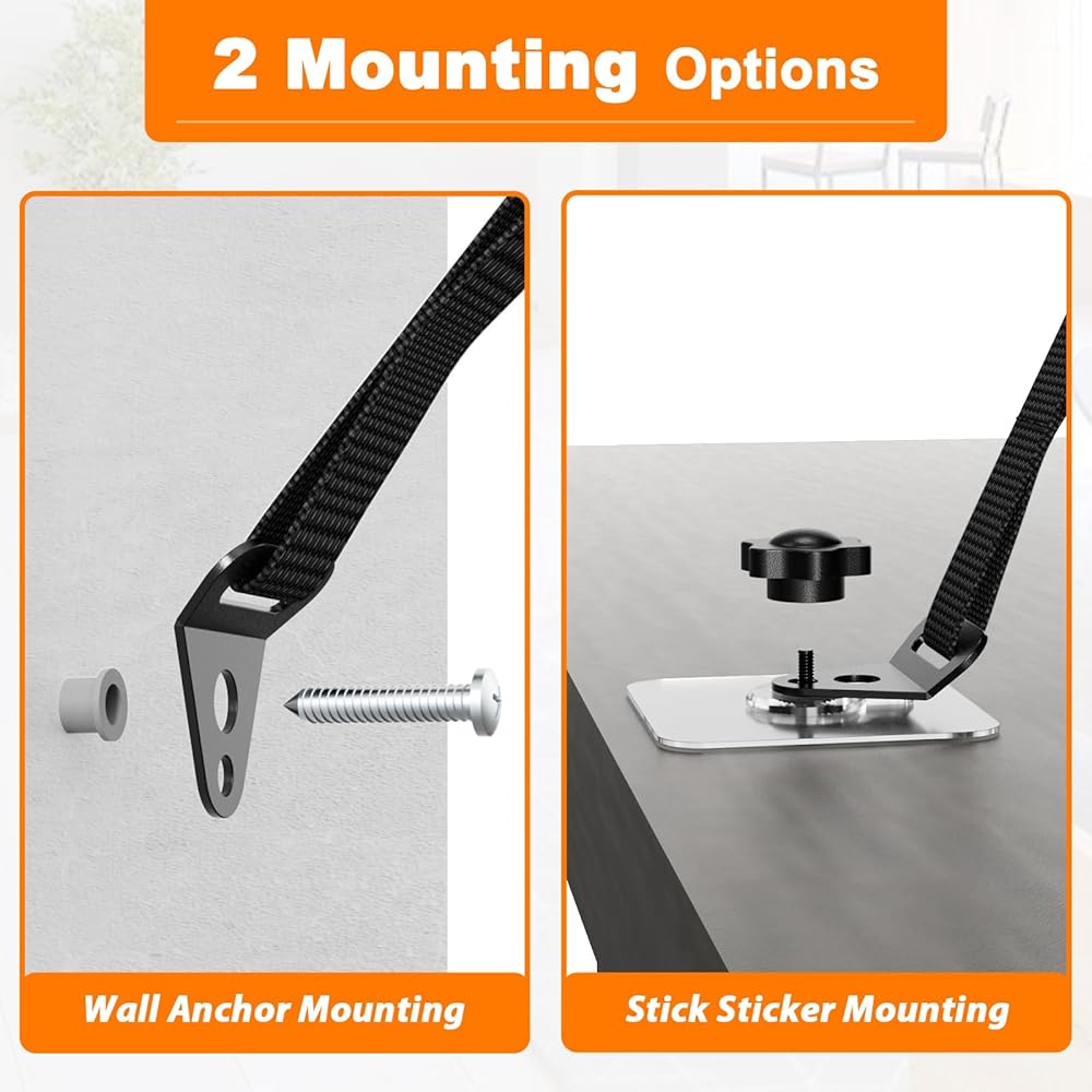 خياران للتركيب: يمكن تركيب مجموعة أدوات التثبيت المضادة للتلفاز على الحائط أو تركيبها من نوع التثبيت اللاصق. *ملاحظة: (1) لتثبيت المادة اللاصقة، يرجى عدم تحريك المنتج لمدة 72 ساعة بعد التثبيت. ملاحظة: (2) يرجى ملاحظة أن التأثير اللاصق للملصق اللاصق سوف يتدهور إذا تم تقشير الملصق بعد التثبيت.