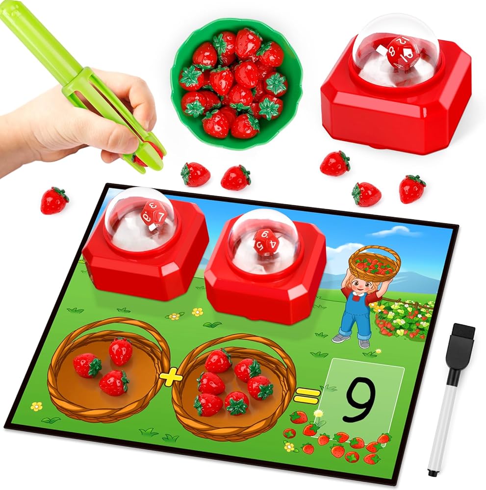 كيف يعمل: يستخدم الأطفال أدوات النرد لخلق مشاكل إضافية. ثم يضعون العدد المقابل من حبات الفراولة على لوحة المسح الجاف، ويعدونها لحل المسألة، ويكتبون إجاباتهم مباشرة على اللوحة