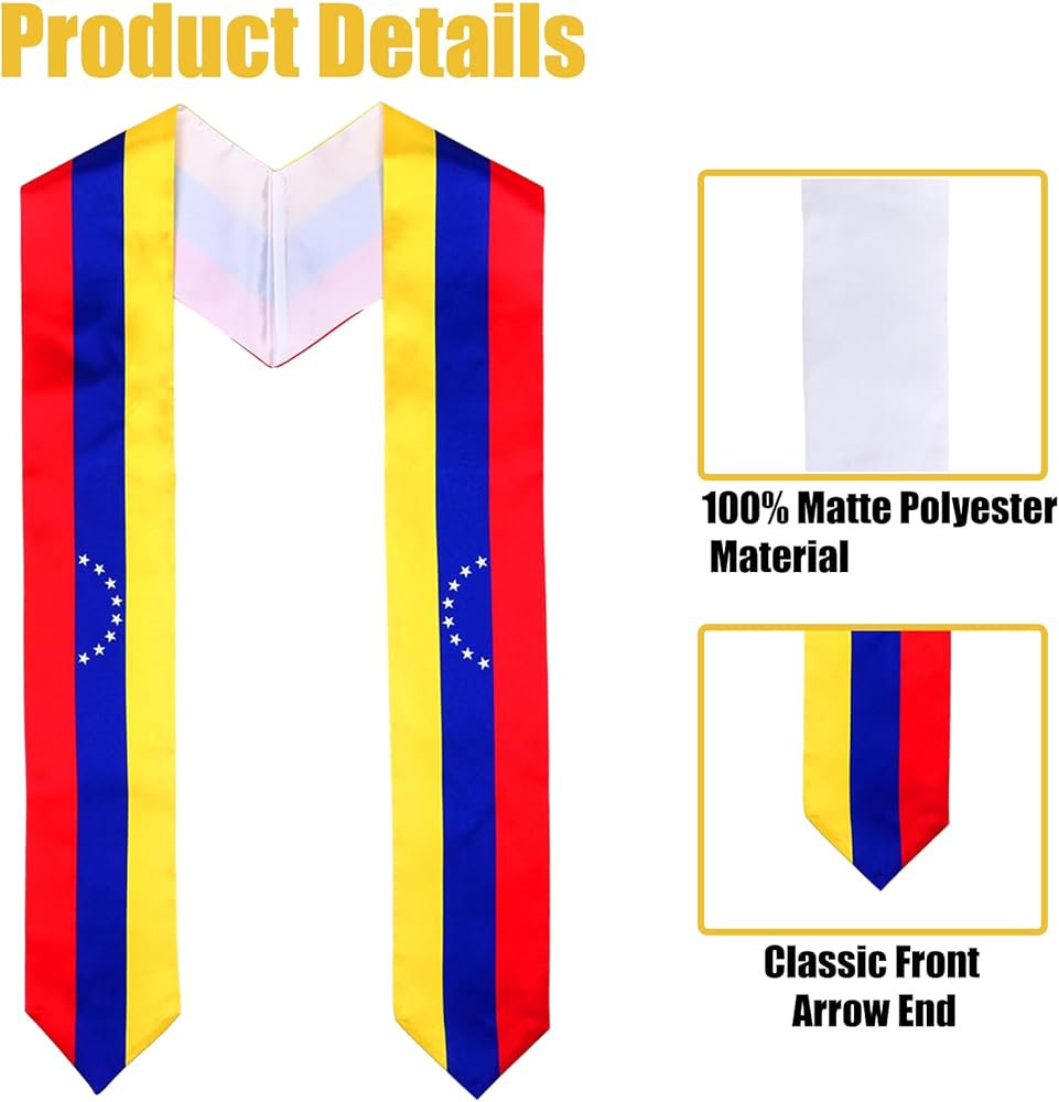 المقاس: يبلغ طول هذا الوشاح حوالي 72 بوصة وعرضه 4.5 بوصة، ويناسب جميع الخريجين الفنزويليين بشكل مريح.