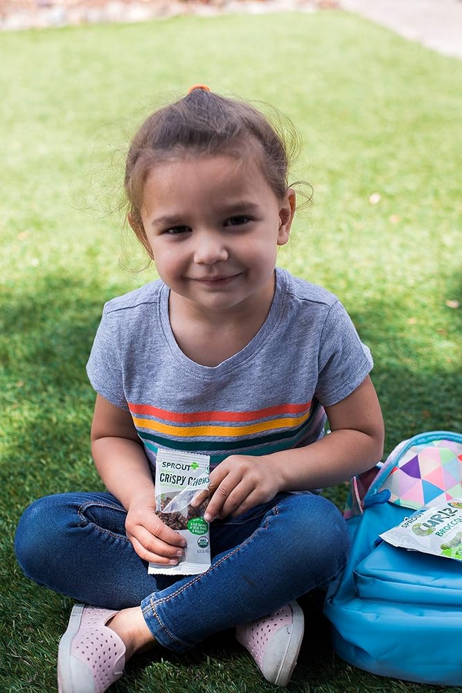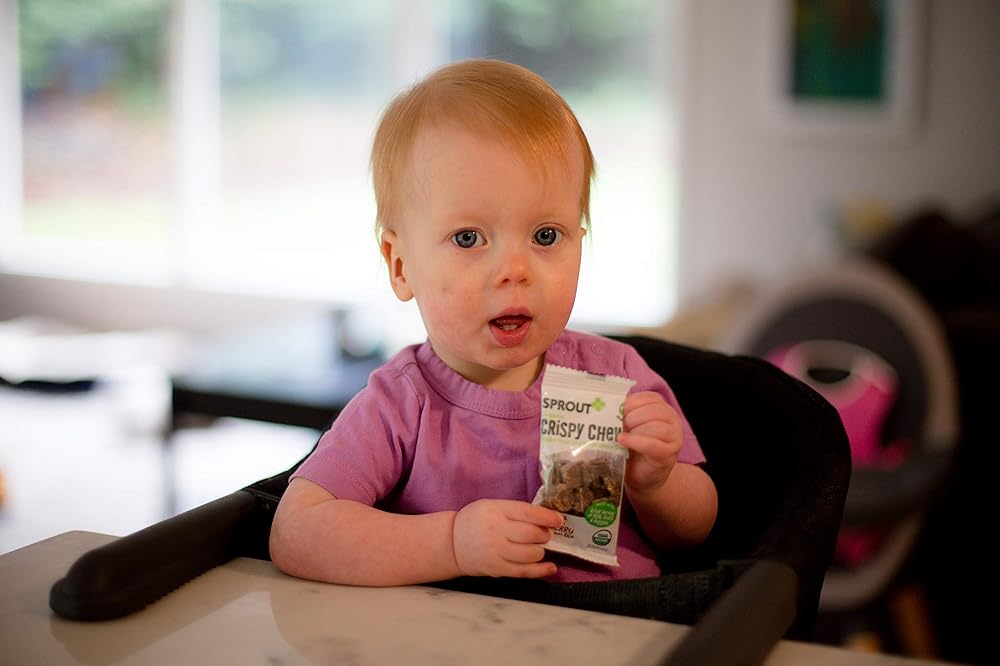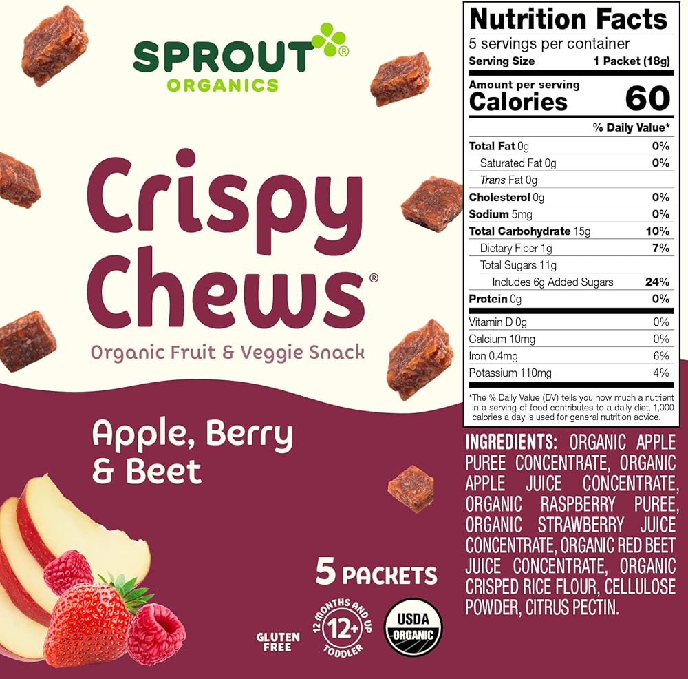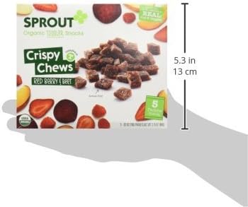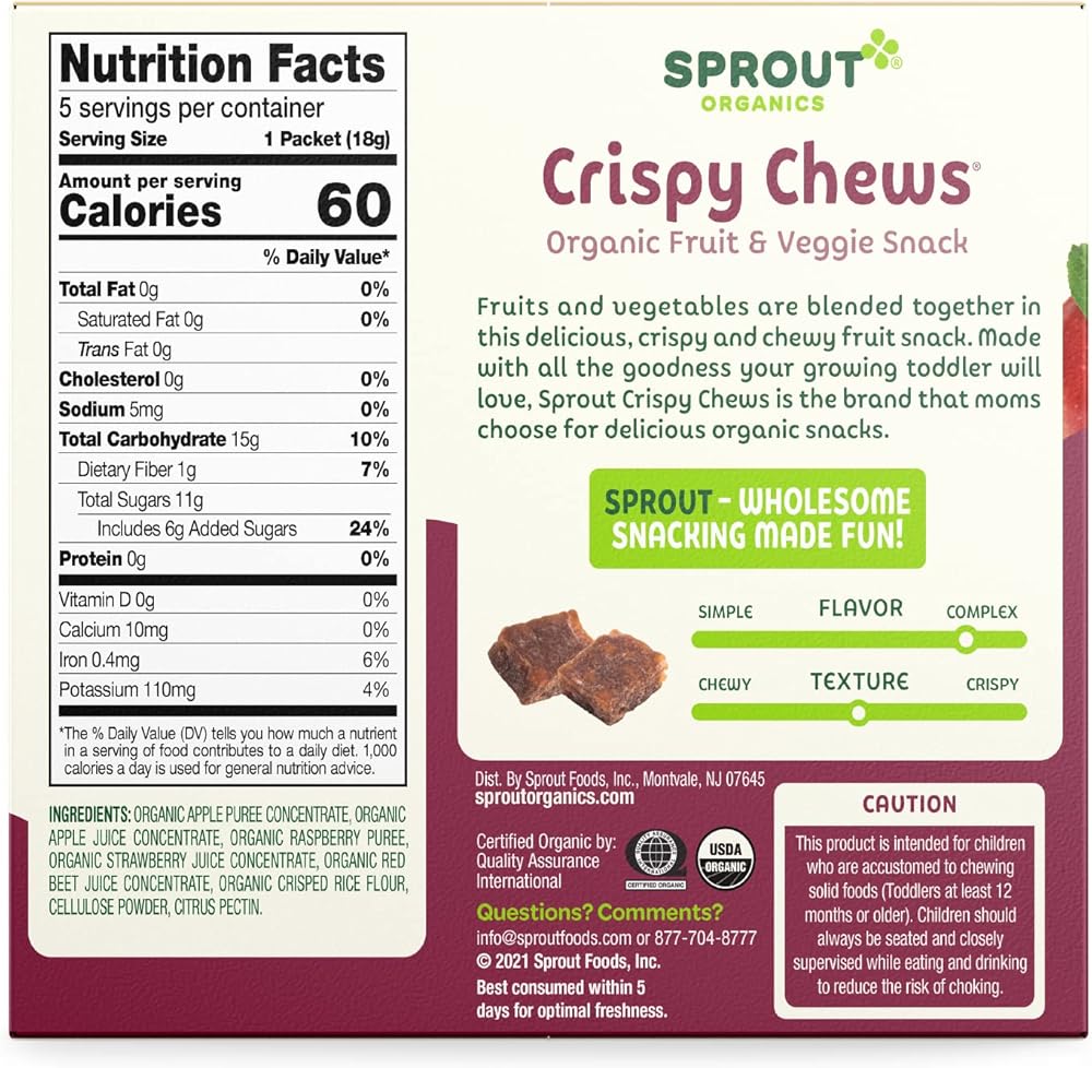 Sprout Organic Crispy Chews is a delicious toddler snack, made with crisped whole grain rice and a full serving of REAL fruits and vegetables. Bite-sized pieces are perfect for little fingers learning to pick up and self-feed, and toddlers love the soft, crispy and chewy texture. Each 3.15-ounce box contains (5) single packet portions that are convenient for on-the-go snacking. Sprout Crispy Chews are USDA certified organic, non-GMO, gluten free, dairy-free, and vegan, and contain no preservatives, added flavors or colors. At Sprout, we believe that a meal is more than nourishment. It's a chance to inspire and grow together. That's why we are committed to introducing an early love of healthy, whole organic foods to children everywhere. Research shows that starting babies on healthy foods early in development helps foster healthy eating habits through life. That's why we've crafted a variety of fruit, vegetable, and grain blends that help babies adapt to new flavors and textures and provide greater exposure to wholesome foods. We procure ingredients from only certified-organic growers and will not accept harvested ingredients with any preservatives. We rigorously source these special ingredients to ensure the cleanest recipes are delivered to your family.