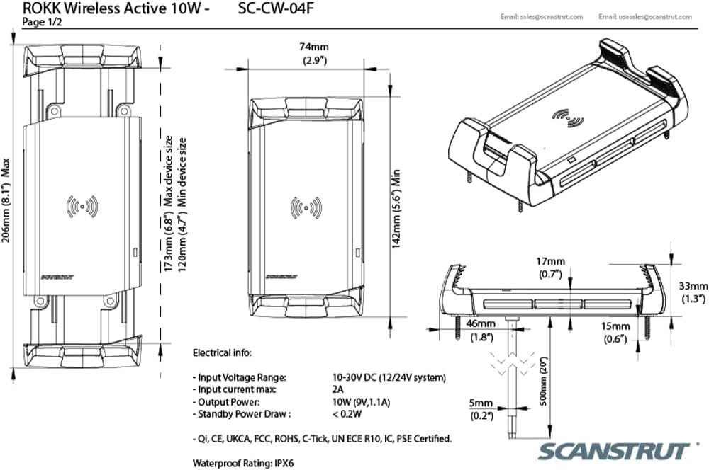 Scanstrut ROKK اللاسلكي - نشط. حامل شحن الهاتف اللاسلكي المقاوم للماء 10 وات 12/24 فولت