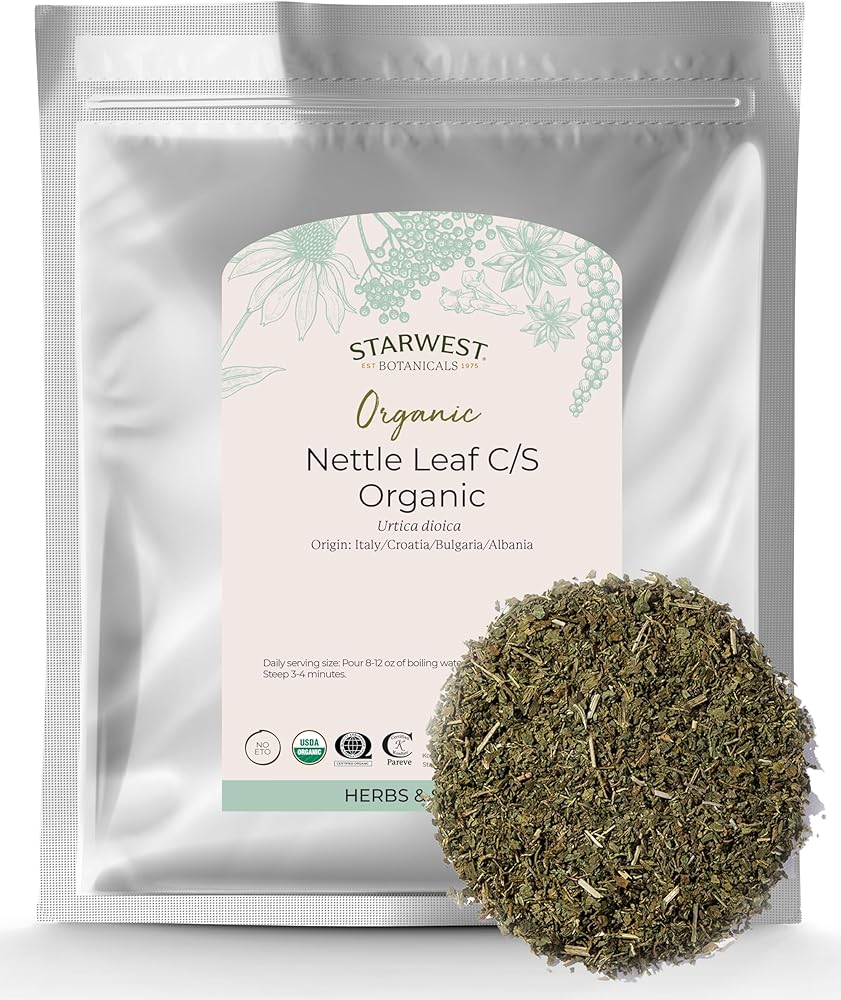 1 lb of Organic Nettle Leaf Cut and Sifted (C/S), packaged in a resealable mylar bag.