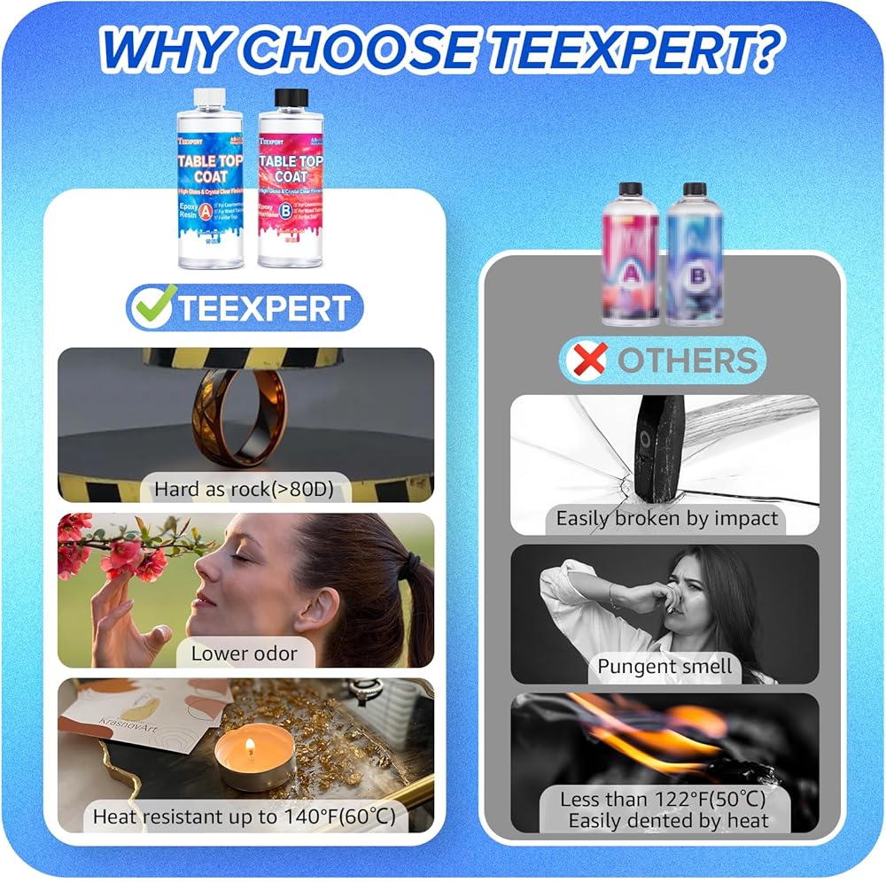 تركيبة آمنة وعديمة الرائحة: مع التركيز على الاستدامة البيئية وتحسين تجربة المستخدم، فإن راتنجات الإيبوكسي المطلية على سطح الطاولة من Teeexpert عديم الرائحة وغير سام ولا يحتوي على مذيبات وغير قابل للاشتعال، ويتوافق مع معايير ASTM D-4236. هذا الراتينج الإيبوكسي المكون من جزأين مناسب للمبتدئين أو المحترفين، وتحتاج فقط إلى مزج الراتينج والمقوي بنسبة حجم 1:1، ولا داعي للقلق بشأن عين السمكة أو الحفر.
