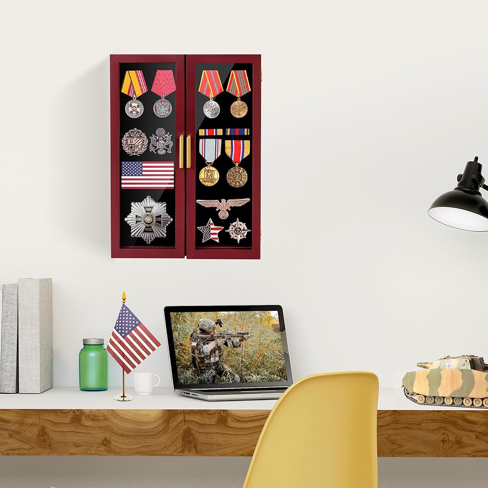 【من السهل إظهار مجموعتك】: يأتي صندوق الظل العسكري بلون بني محمر فريد يسلط الضوء على جمال التجميع أثناء تزيين المنزل. إطار عرض الميداليات المكون من 7 طبقات يغطي مجموعة واسعة من المقتنيات مثل الجيش والبحرية والقوات الجوية والشرطة وغيرها من عملات التحدي العسكرية والميداليات واللوحات والكشتبانات.