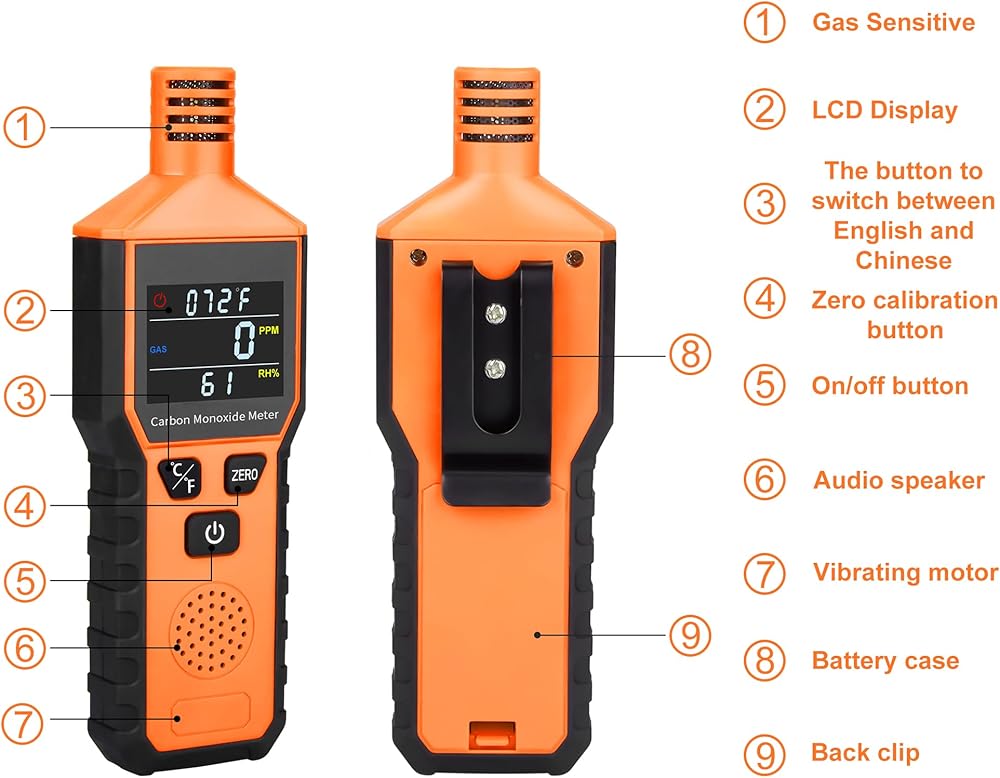 • 【شاشة 3 في 1】عرض غاز أول أكسيد الكربون ودرجة الحرارة والرطوبة؛ يتيح لك رؤية حالة البيئة المحيطة بنظرة سريعة ومسحها.