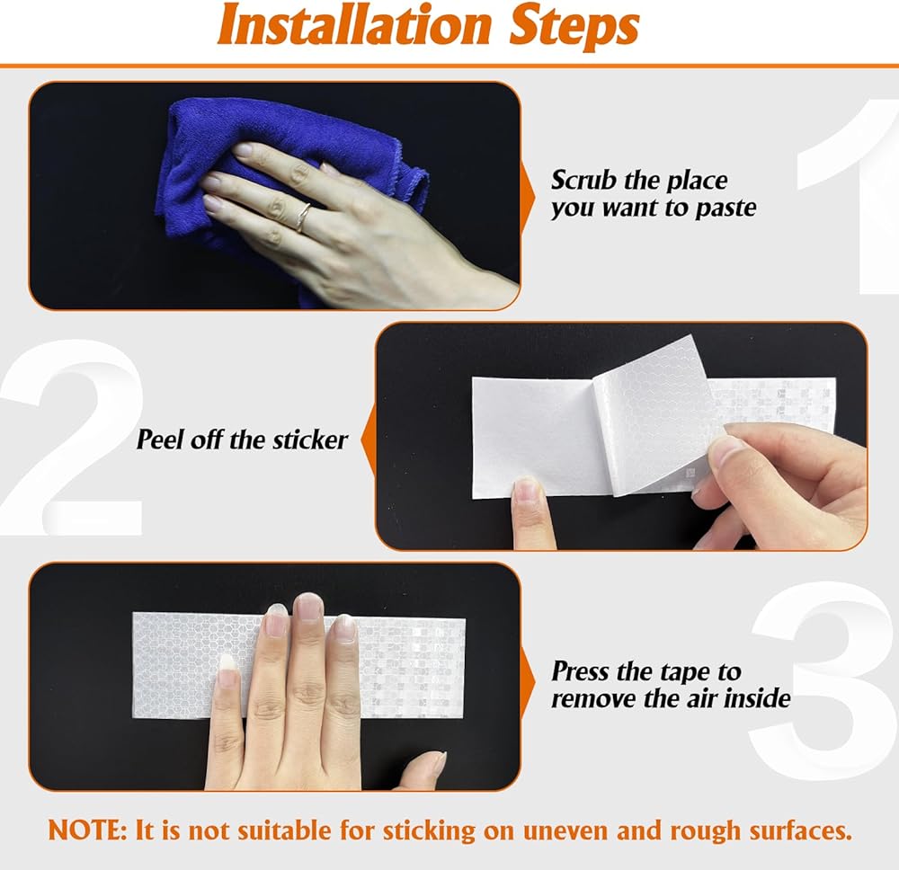 ملحوظة: يرجى تنظيف الغبار والبقع الموجودة على سطح الجسم قبل الاستخدام. اضغط عليه بلطف للتأكد من وضعه بشكل آمن. يمكنك لصق هذا الشريط العاكس على أي سطح أملس ومسطح، ولكن يرجى عدم لصقه على العناصر غير المستوية والخشنة وعالية الانحناء، وإلا فقد يسقط.