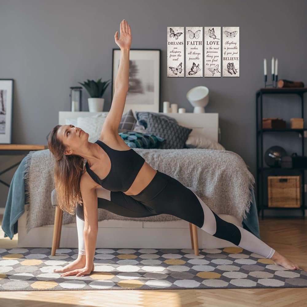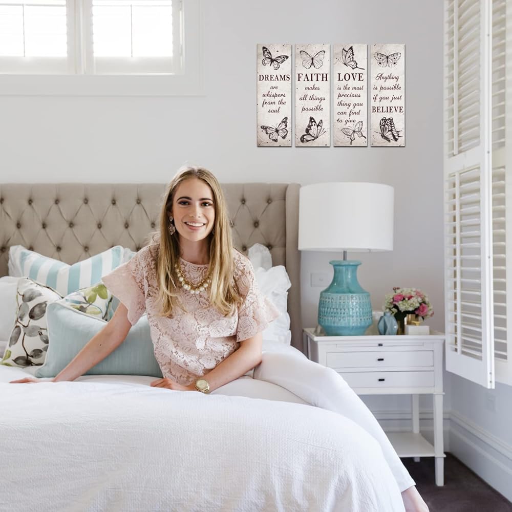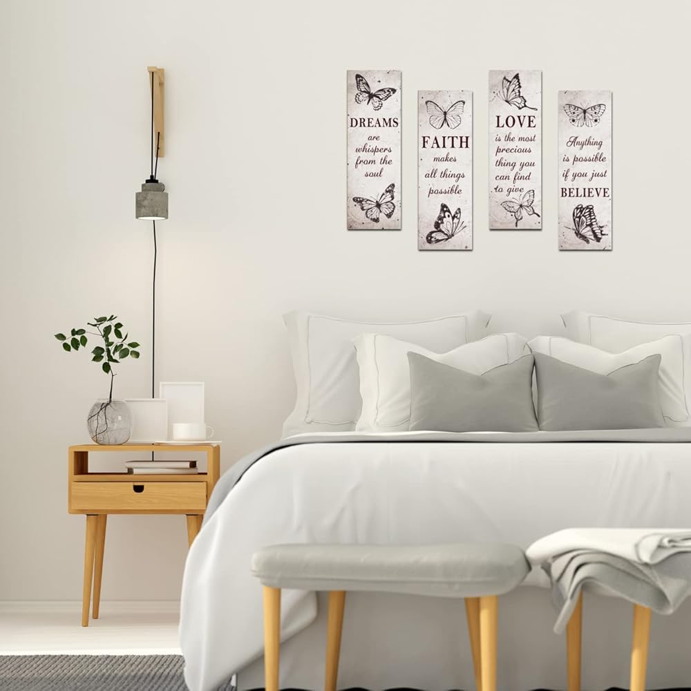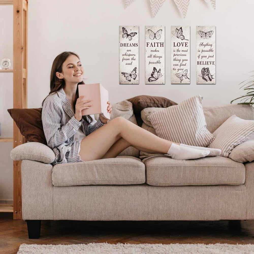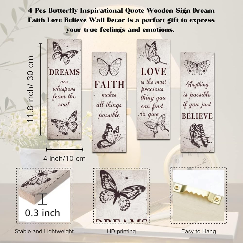 • 【مجموعة قيمة 】ما ستحصل عليه هو 4 قطع من ديكورات حائط غرفة المعيشة بأنواع مختلفة. تتميز بصورة جميلة للفراشة مع بعض "الأقوال" الملهمة عن الإيمان والحب والأحلام والأمل. وهذا يجعلها قطعة ديكور رائعة لجميع المناسبات.