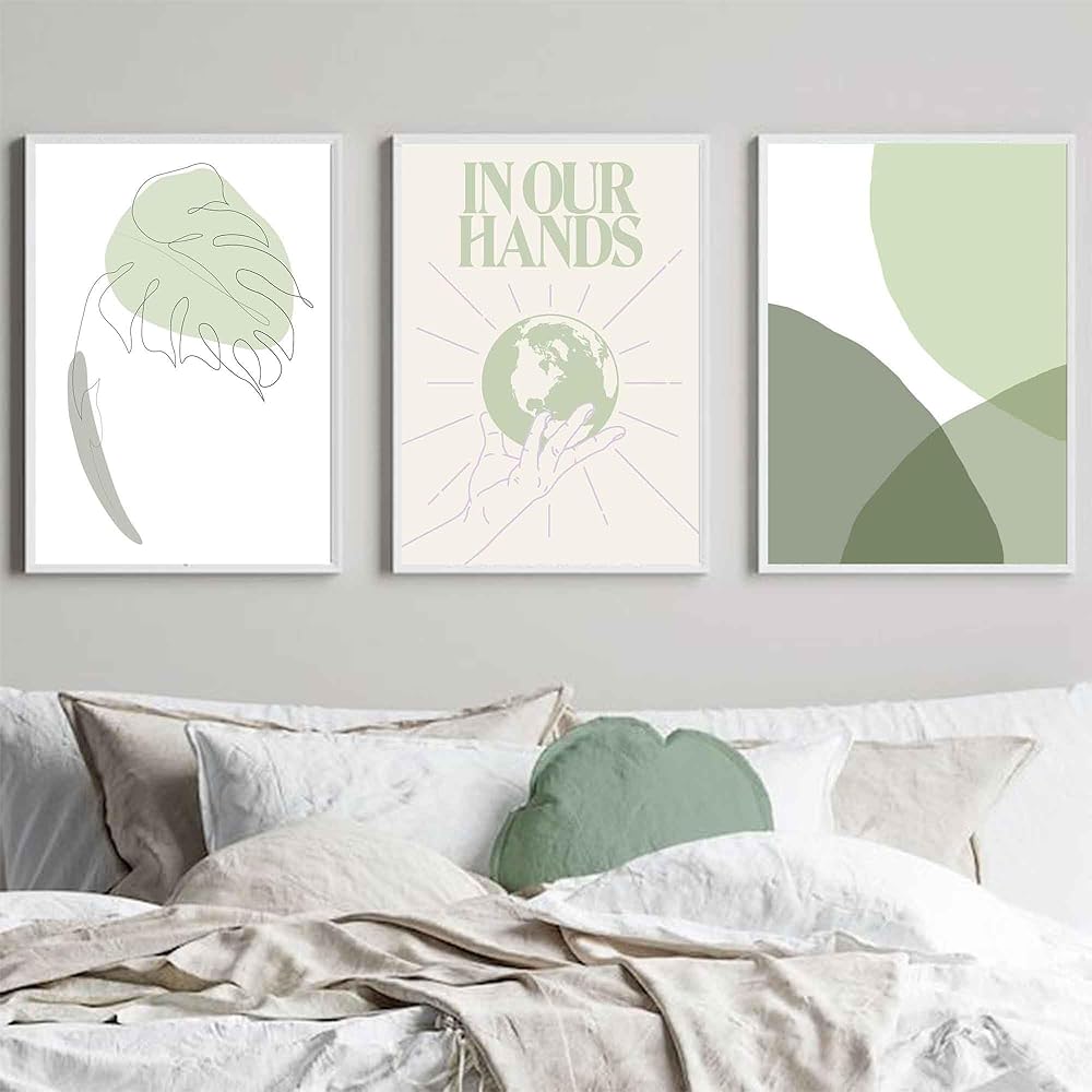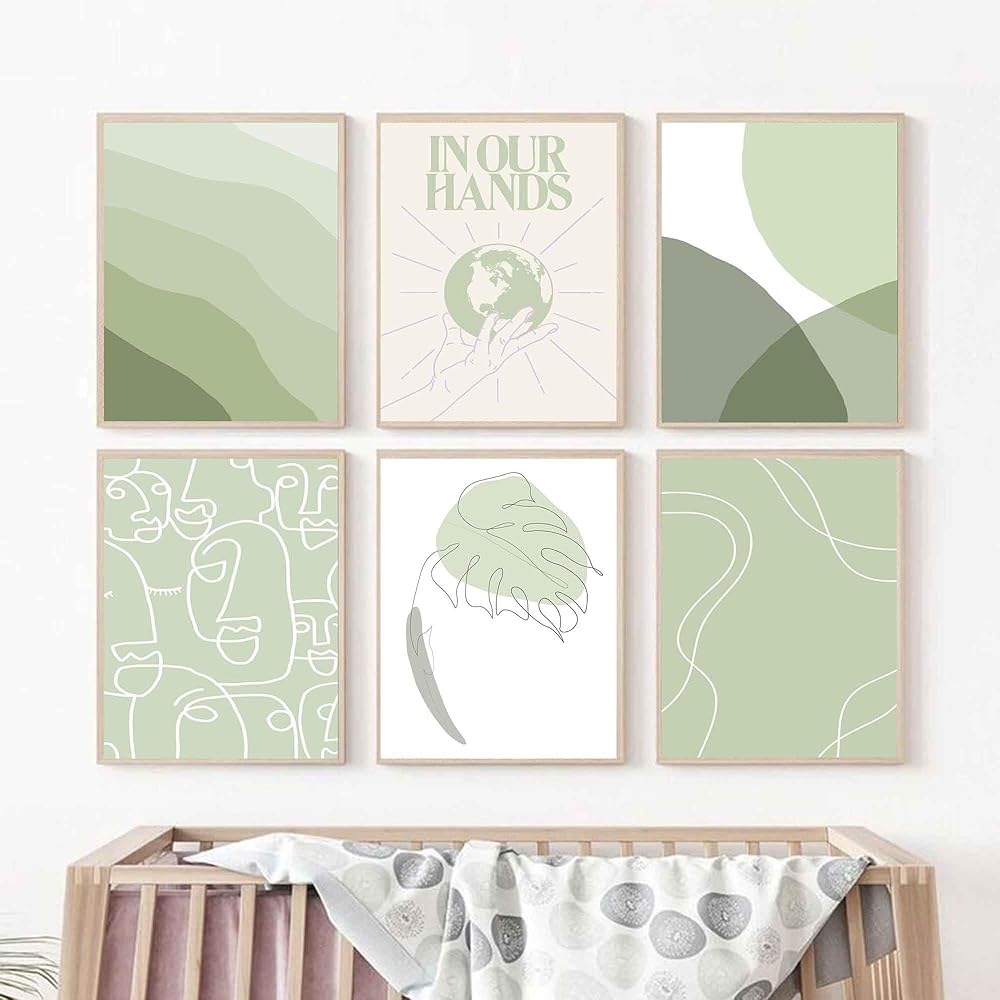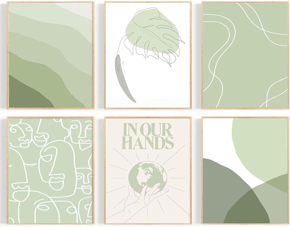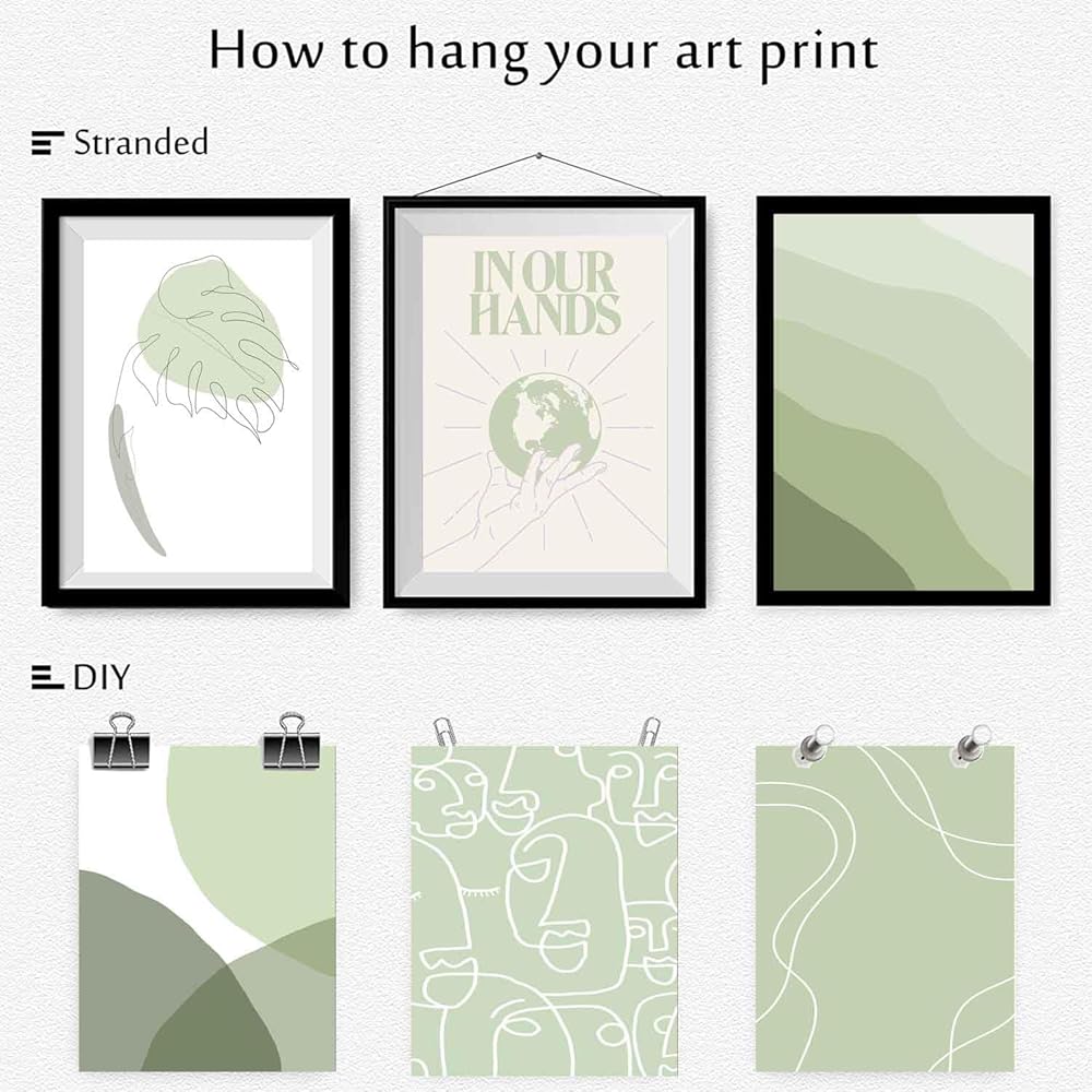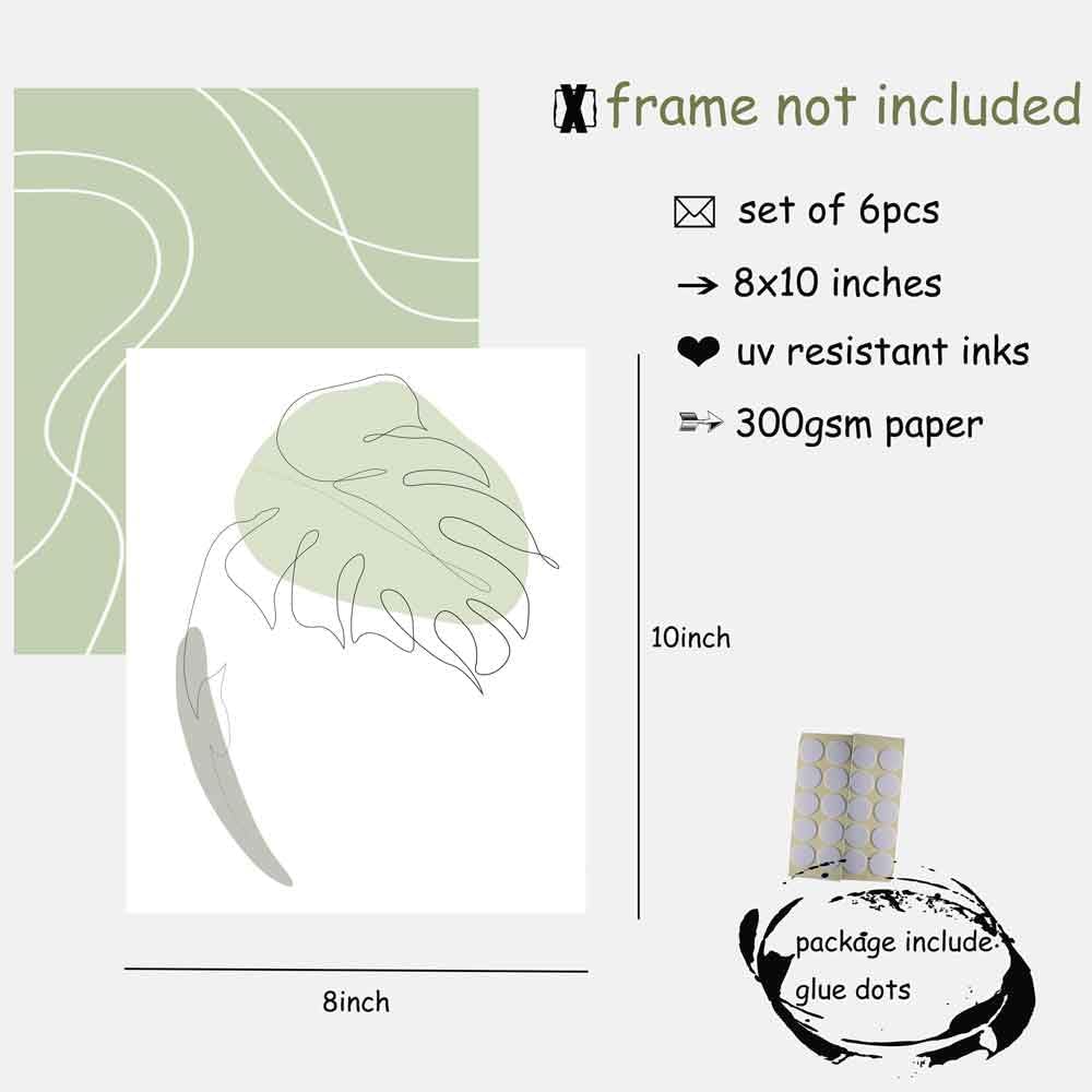 مطبوعات فنية باللون الأخضر المريمية: حجم مجموعة الطباعة الجدارية باللون الأخضر المريمية هو 8 × 10 بوصة. هناك 6 قطع من ملصقات الحائط المحايدة تأتي غير مؤطرة، يمكنك تصميم طريقة التعليق بنفسك كما تريد. تعتبر الأنماط البسيطة والمجردة للمطبوعات الخضراء المريمية مناسبة لأسلوب الزخرفة ذو الشخصية أو الزخرفة اللطيفة
