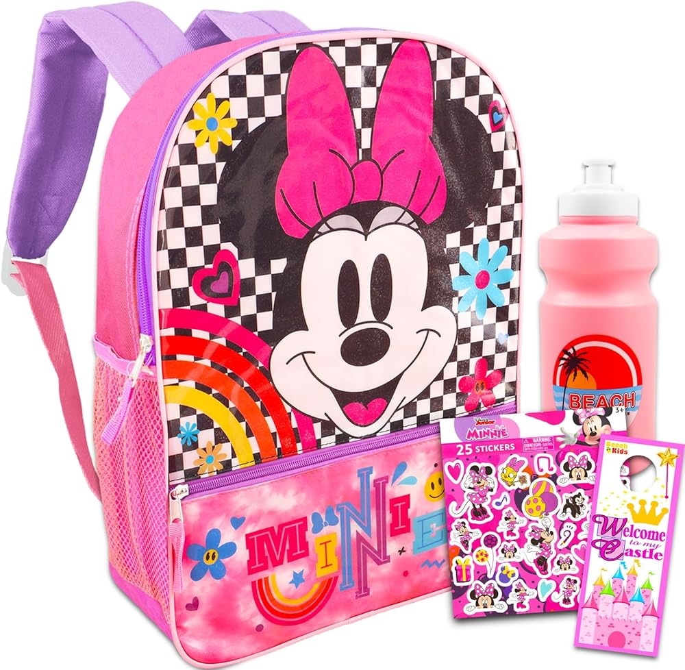 حقيبة ظهر ميني ماوس مرخصة رسميًا للفتيات تتضمن أيضًا زجاجة مياه وملصقات ميني وشماعة باب قلعة الأميرة.