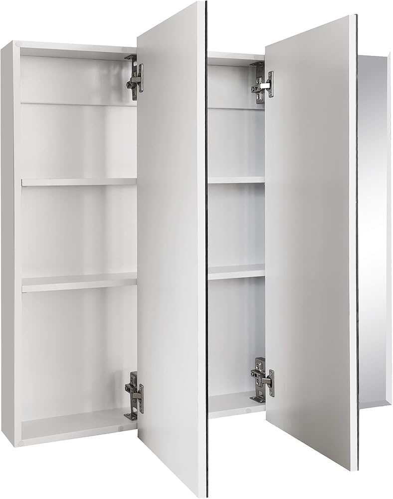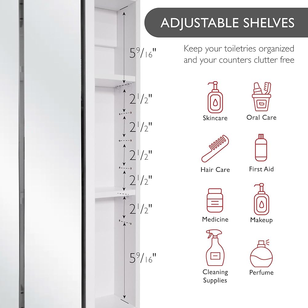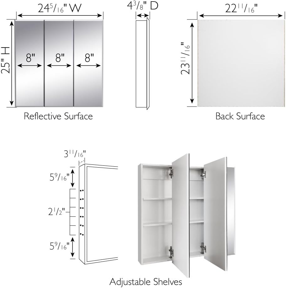 أبعاد خزانة الأدوية: يبلغ قياس خزانة الحمام 36.3 بوصة عرضًا × 4.4 بوصة عمقًا × 30.1 بوصة ارتفاعًا مع 3 أبواب ذات مرايا ورفين قابلين للتعديل