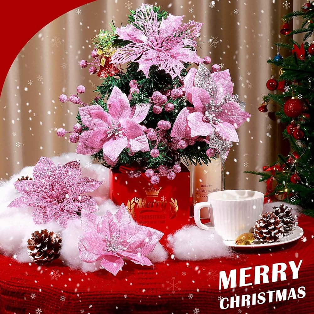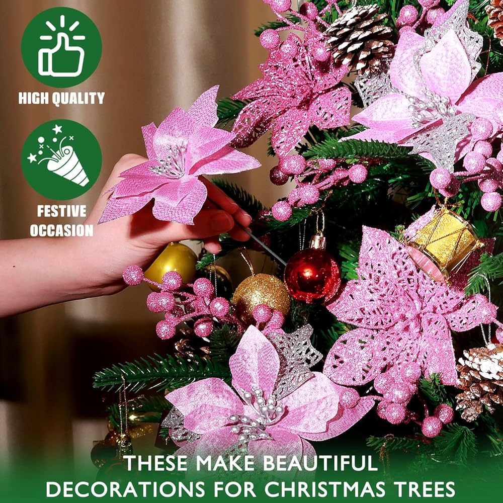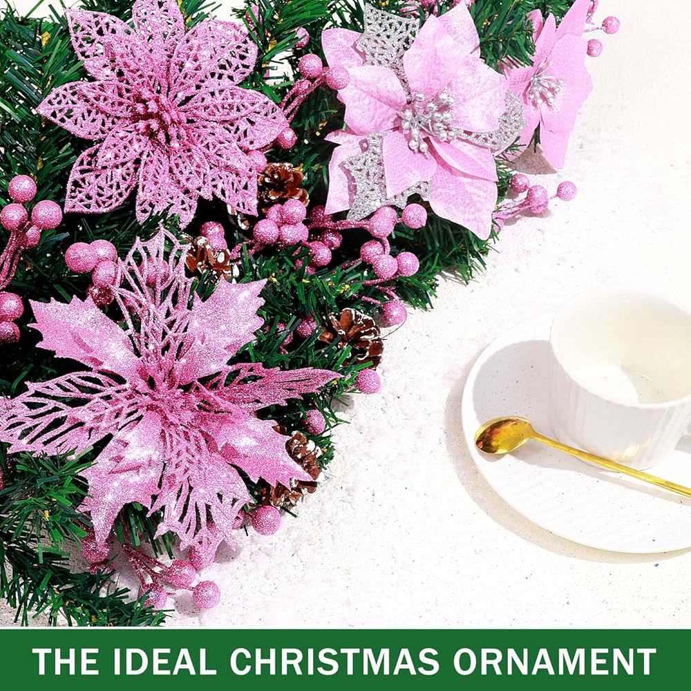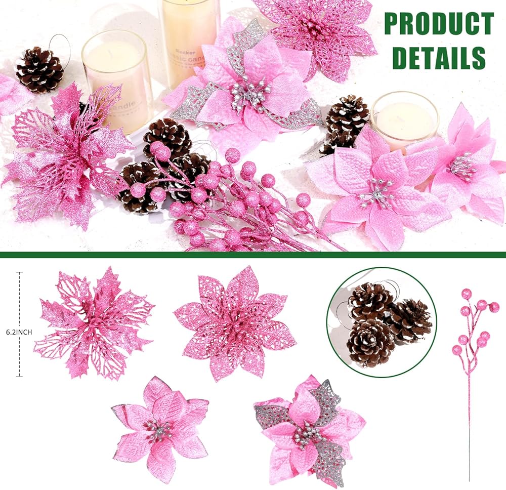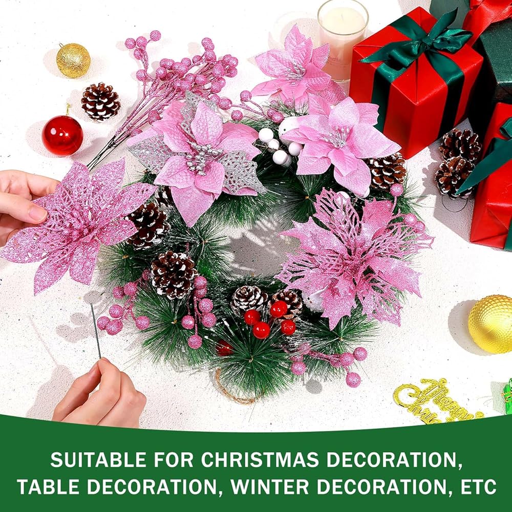 【عبوة قيمة للغاية】سوف تحصل على عبوة من سيقان التوت اللامعة لعيد الميلاد، وزهور البونسيتة اللامعة لعيد الميلاد في 4 أنماط وسيقان فريدة من نوعها، ومخاريط الصنوبر مع خيط، مما يوفر لك كمية وافرة لاحتياجات تزيين وحرف عيد الميلاد الخاصة بك.