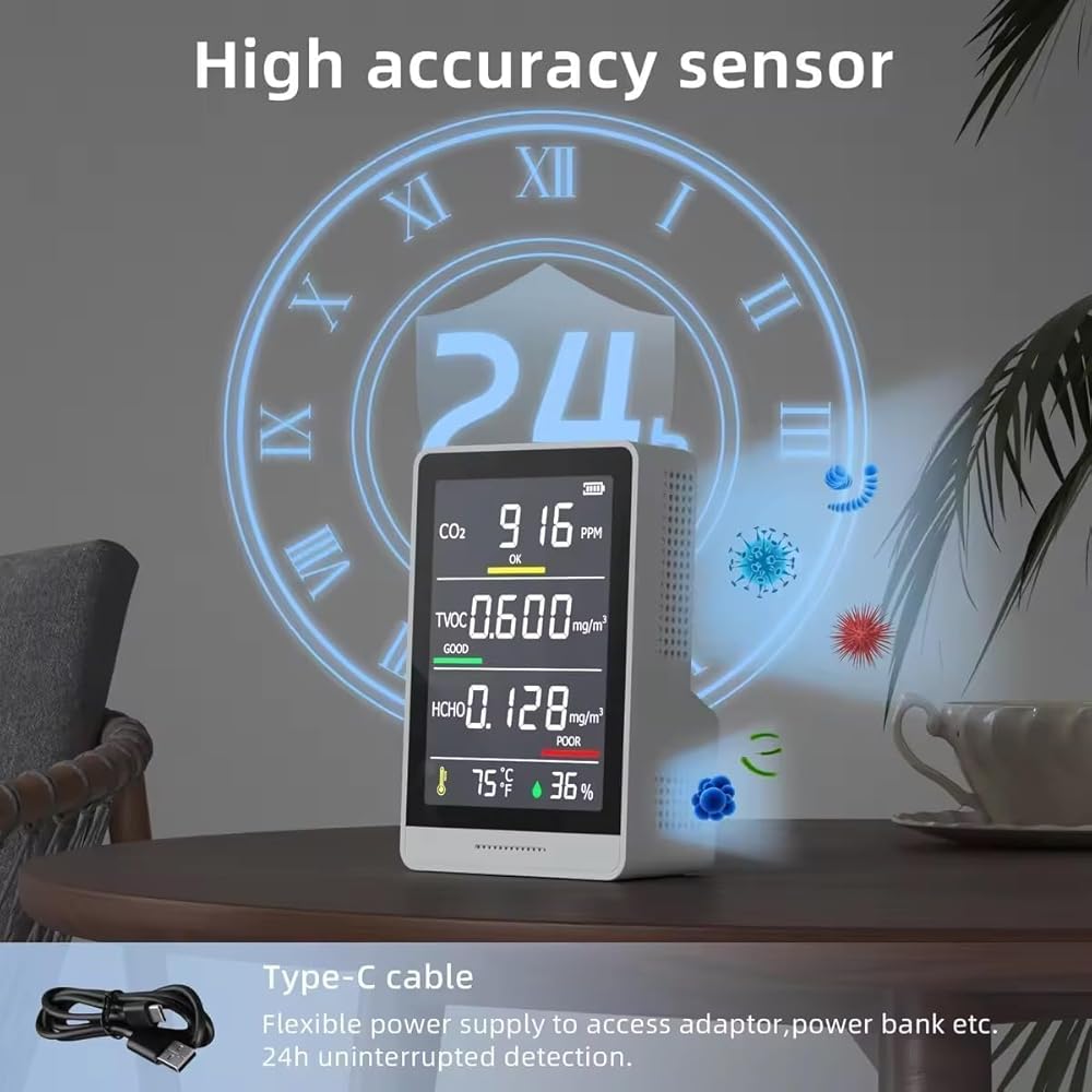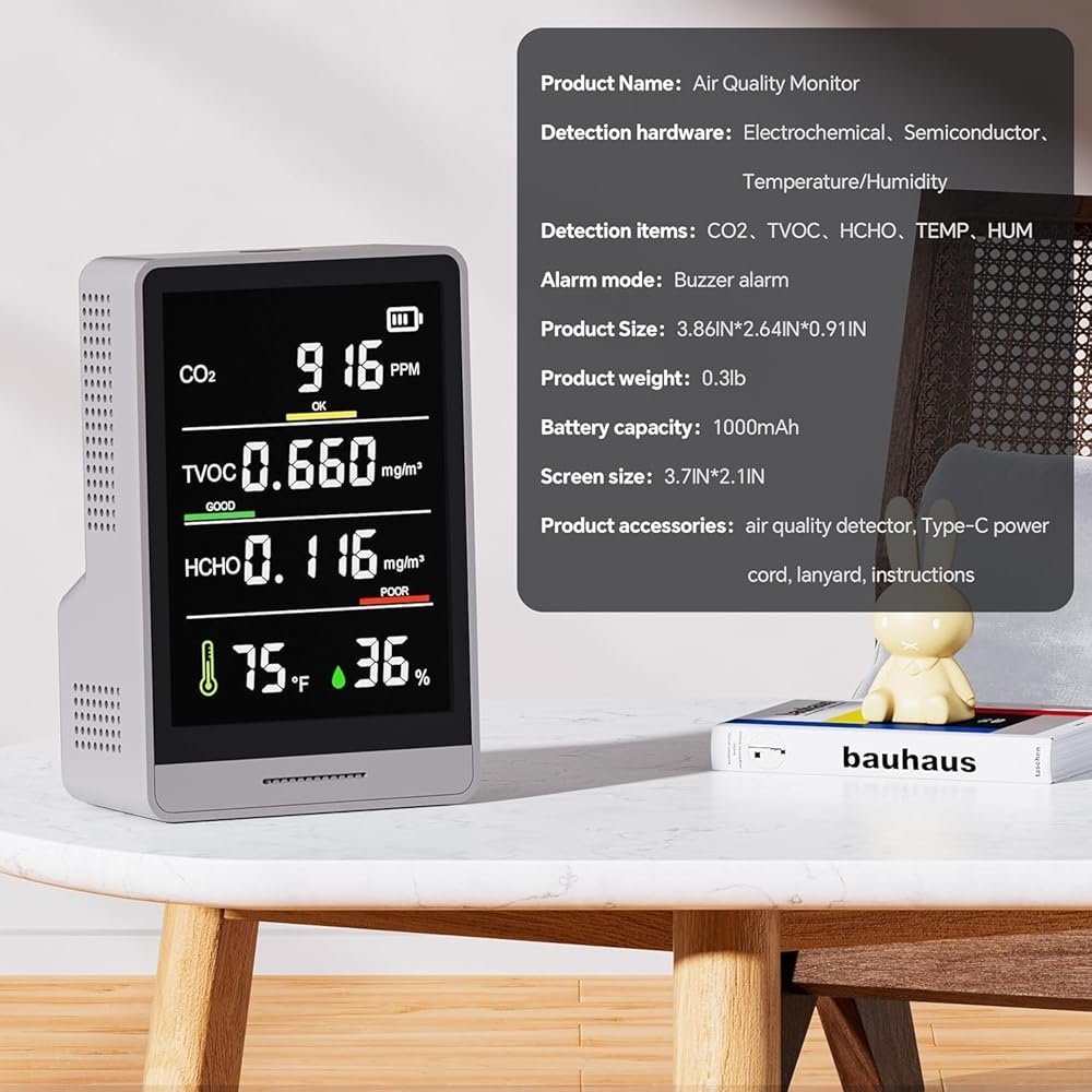 【مقياس جودة الهواء متعدد الوظائف】يمكن لجهاز اختبار جودة الهواء 5 في 1 أن يكشف بدقة في الوقت الحقيقي عن ثاني أكسيد الكربون (CO2)، والفورمالديهايد (HCHO)، والمركبات العضوية المتطايرة (TVOC)، ودرجة الحرارة والرطوبة. من الضروري معرفة جودة الهواء في المكان الذي تعيش فيه، ويمكن أن يساعدك ذلك على فهم جودة الهواء الداخلي في لمحة واحدة.