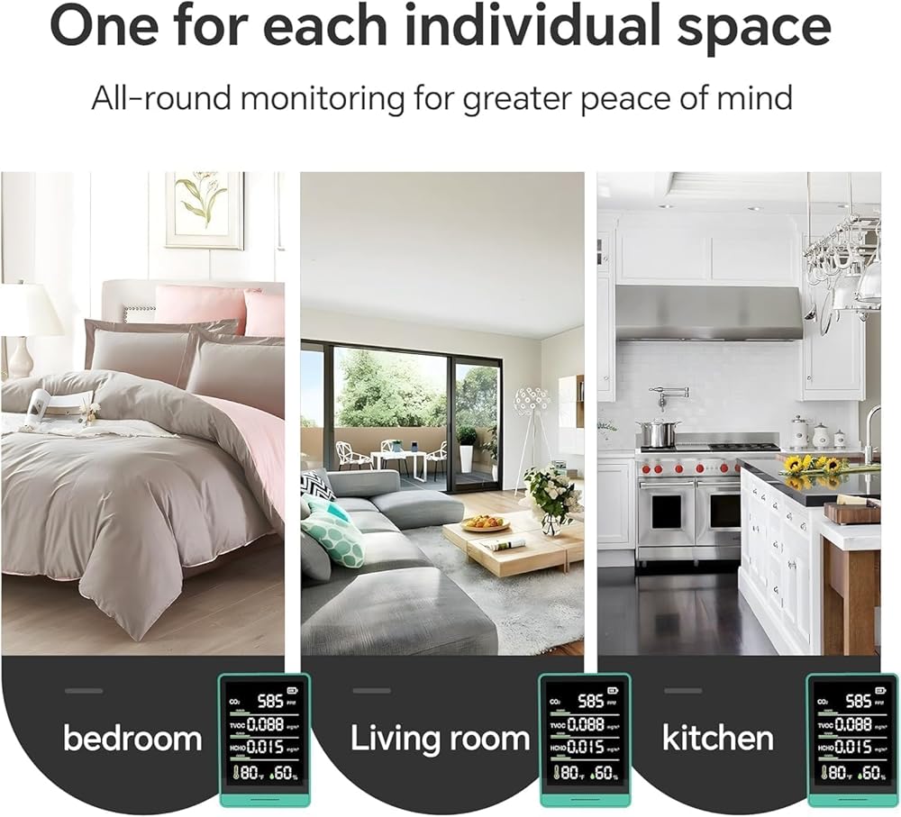 【تطبيق واسع】مقياس جودة الهواء الداخلي هذا صغير ومحمول، ويمكنه الكشف عن جودة الغاز في غرفة النوم وغرفة المعيشة والمطبخ والمكتب والسيارة والمدرسة والفندق والأقبية والمطاعم والمخيم والبيئات الأخرى. إنها مناسبة للكشف عن الهواء المنزلي، والكشف عن هواء السيارة، وغرفة النمو، والكشف عن هواء غرفة الأم والطفل، والكشف عن الأماكن العامة وما إلى ذلك.