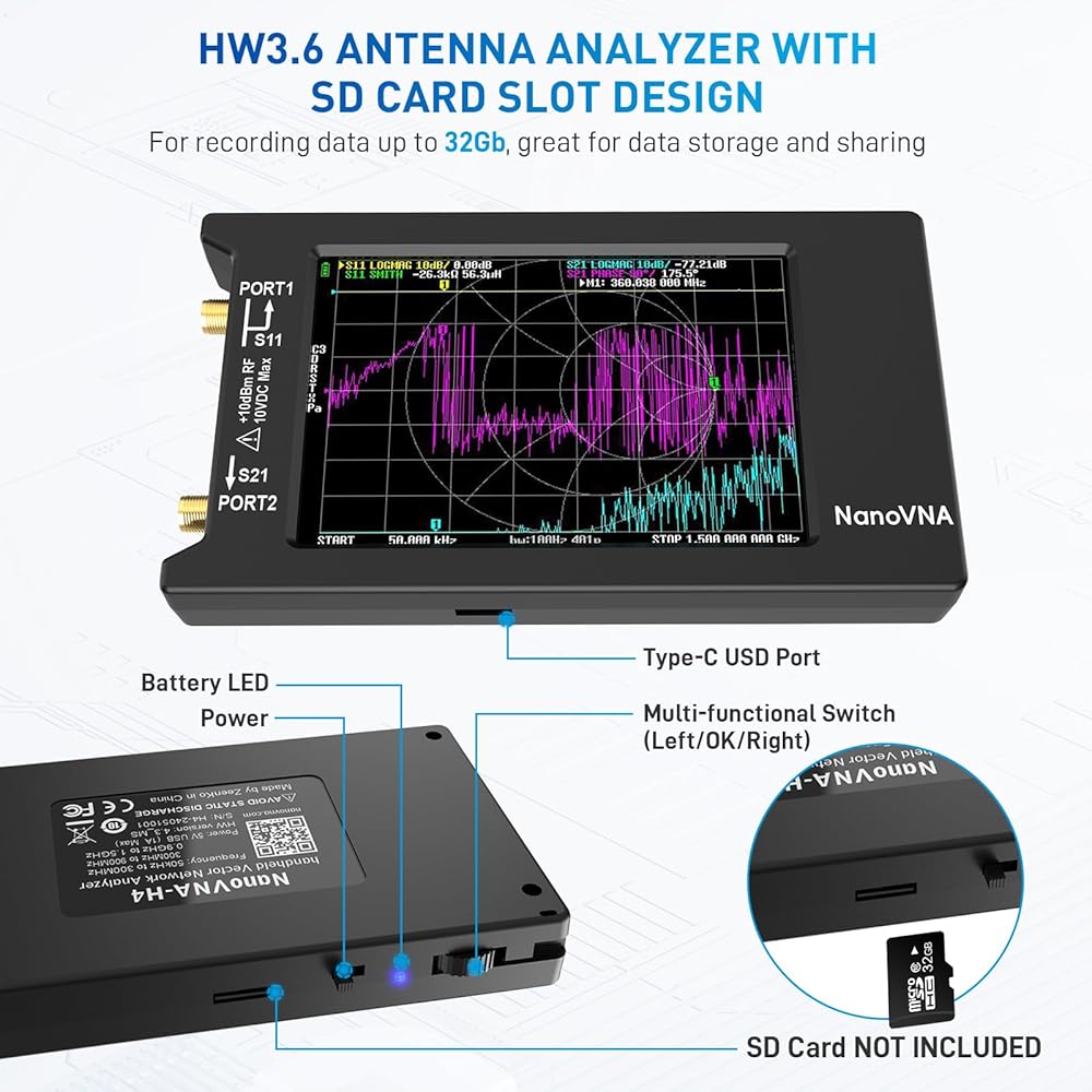 • 【ترقية NANOVNA-H4 V4.3 】 توفر ALIESTFDNO nanovna-h4 إمكانات مثالية لقياس شبكة المتجهات، مدمجة ومحمولة باليد، قائمة بذاتها مع شاشة LCD مقاس 4 بوصات، مع بطارية 1950 مللي أمبير تعمل بالطاقة أو تعمل بمنفذ USB. مع أحدث إصدار HW 4.3، تمت إضافة محلل هوائي Nanovna-h4 لوحة جديدة تمامًا بالإضافة إلى إضافة منفذ SD جديد لتخزين البيانات (يدعم بطاقة ذاكرة تصل إلى 32 جيجابايت، وهي غير متضمنة في العبوة)
