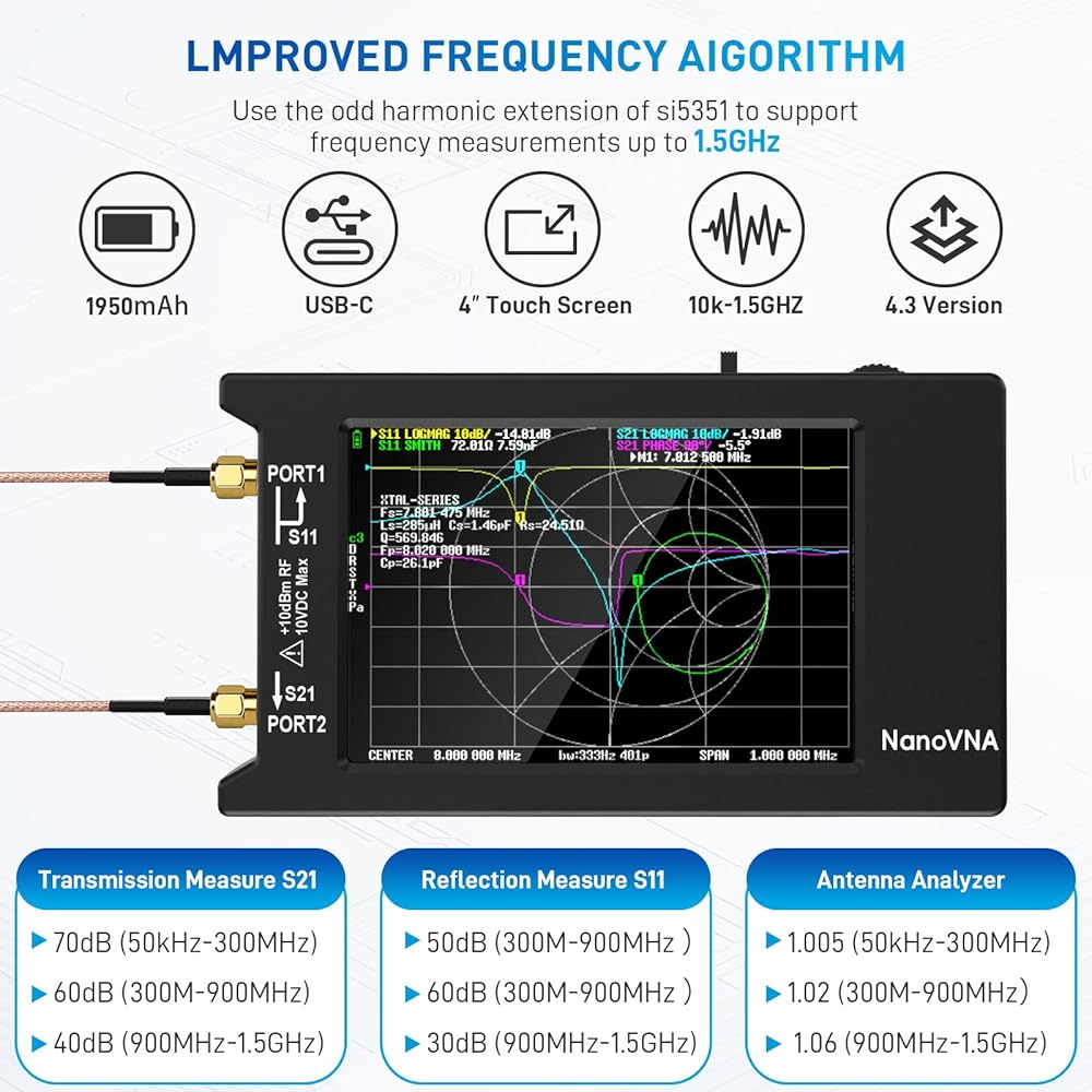 محلل شبكة ناقل NanoVNA-H4، أحدث إصدار V4.3 4 بوصات تعمل باللمس محلل هوائي Nanovna راديو هام 10 كيلو هرتز - 1.5 جيجا هرتز HF VHF UHF، قياس معلمات S، SWR، المرحلة، التأخير، مخطط سميث