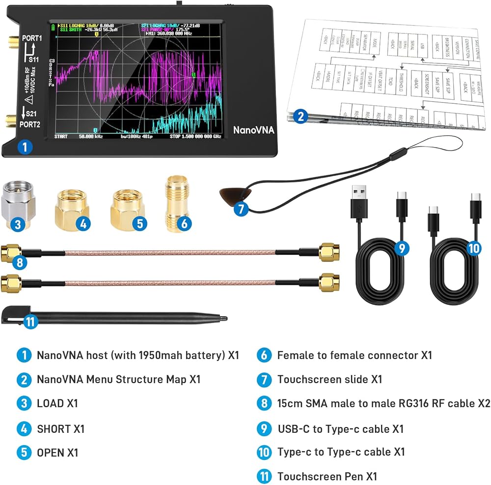 • 【قائمة العبوة】مضيف NanoVNA-H4 (مع بطارية 1950 مللي أمبير في الساعة) ×1، كابل بيانات USB من النوع C ×1، 30 سم/11.8 بوصة SMA ذكر إلى ذكر كابل RG174 RF ×2، مجموعة معايرة بسيطة SMA (مفتوح/تحميل/قصير) ×1، SMA موصل أنثى إلى أنثى ×1، حبل مع قلم ×1، قلم ×1