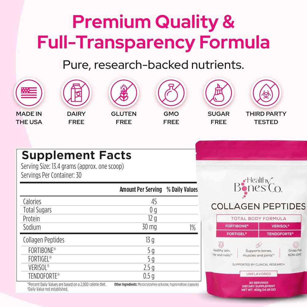 زيادة كثافة العظام: يحتوي هذا الكولاجين على جرعة سريرية من FORTIBONE. وهو ببتيد الكولاجين الوحيد الذي يظهر في الأبحاث السريرية للمساعدة في تحسين كثافة المعادن في العظام وعلامات تكوين العظام لدى النساء بعد انقطاع الطمث. تعمل ببتيدات الكولاجين الموجودة في فورتيبون على تحفيز الخلايا المكونة للعظام لتعزيز إنتاج الكولاجين، وهو أمر ضروري لعظام قوية وصحية. كما أنه يساعد في الحد من انهيار أنسجة العظام. يعد مسحوق الكولاجين النقي هذا رائعًا للرجال والنساء الذين يهدفون إلى تعزيز قوة عظامهم بشكل عام.