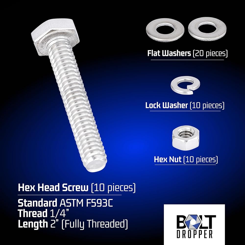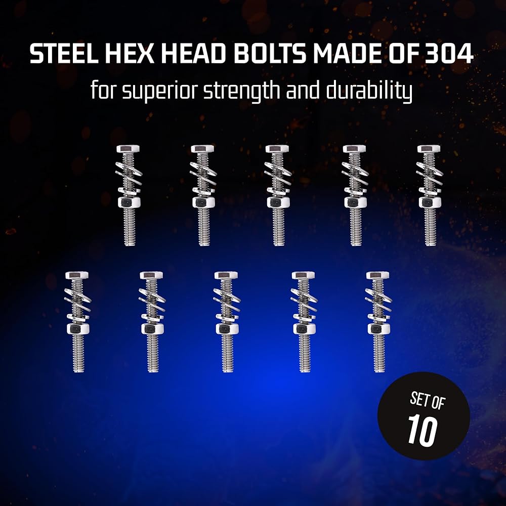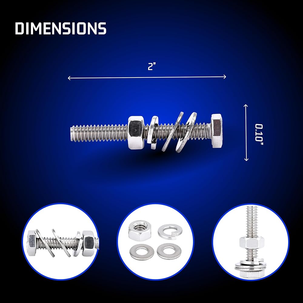 مجموعة أدوات غسل صواميل البراغي: تشتمل مجموعتنا على مسامير وصواميل من الفولاذ المقاوم للصدأ، مما يوفر لك 10 مجموعات لكل طلب. تتميز كل مجموعة بمسمار واحد، و1 صامولة من الفولاذ المقاوم للصدأ، و2 حلقة مسطحة، و1 حلقة زنبركية، مما يجعلها حلاً شاملاً لجميع مهامك.