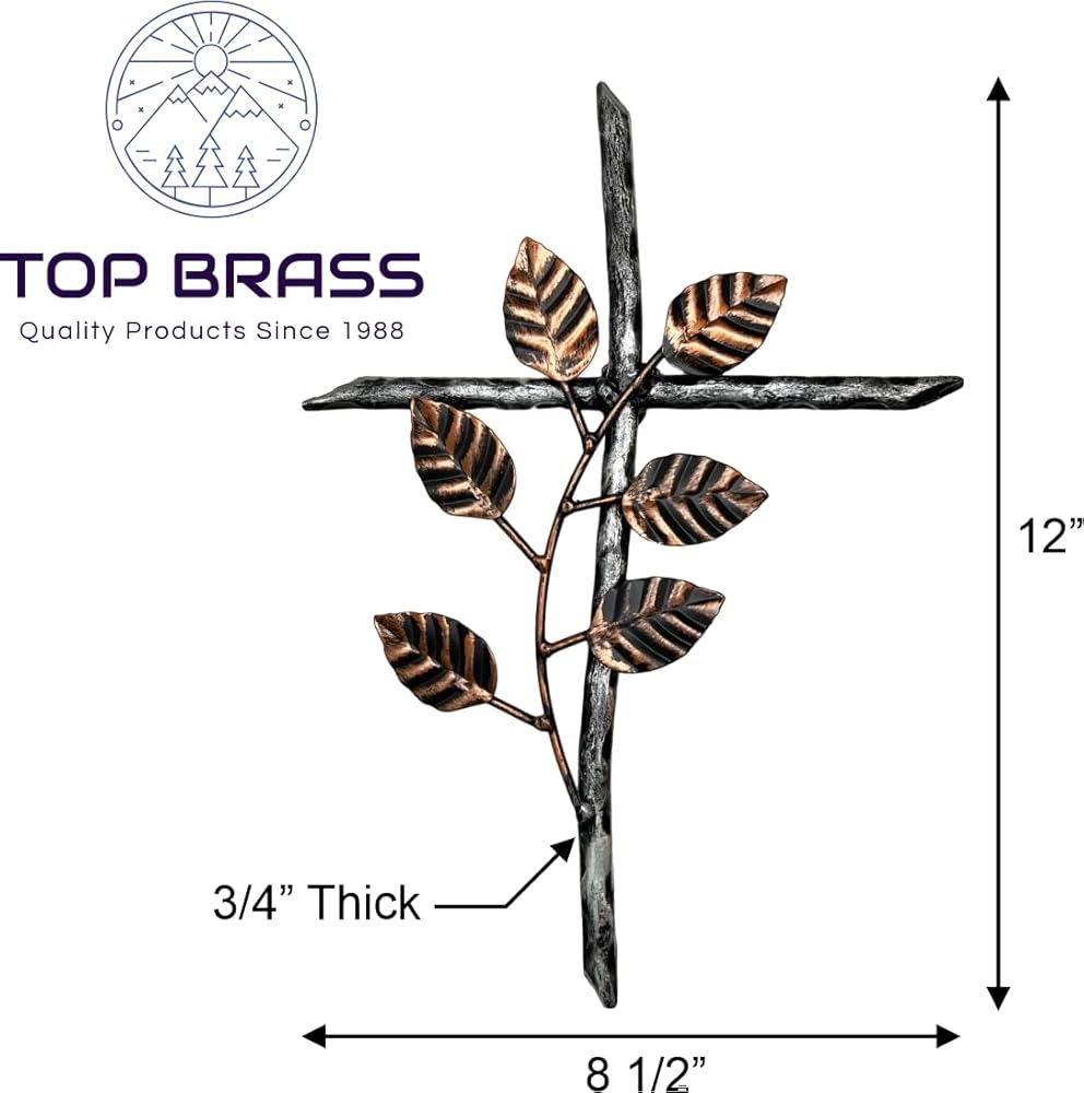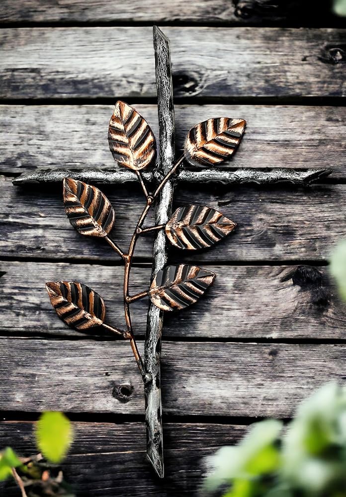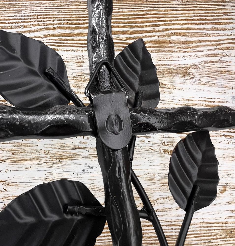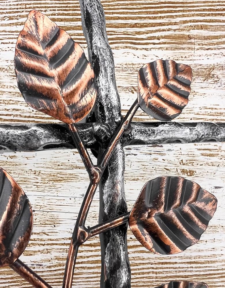 تصميم أنيق - يتميز بقاعدة متقاطعة مصنوعة من الفولاذ المطاوع مع لمسة نهائية فضية ريفية، ومزينة بشكل جميل بفرع صغير منحني بأوراق بلمسة نهائية نحاسية ريفية.