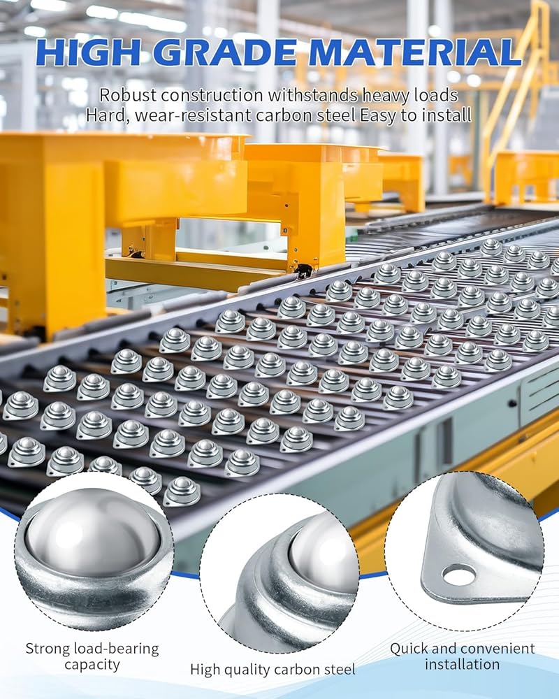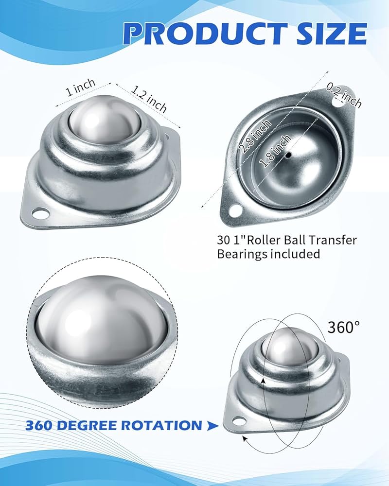 حجم عالمي - يبلغ حجم العجلات الدوارة حوالي 1 بوصة، وتتميز محامل نقل الكرة الدوارة بحجم عالمي، مما يجعلها متوافقة مع مجموعة واسعة من التطبيقات. تضمن أبعادها القياسية إمكانية دمجها بسهولة في إعدادات مختلفة، بدءًا من العجلات الكروية في الآلات وحتى العجلات منخفضة المستوى في الأثاث، مما يوفر حلاً متعدد الاستخدامات لاحتياجات حركتك.