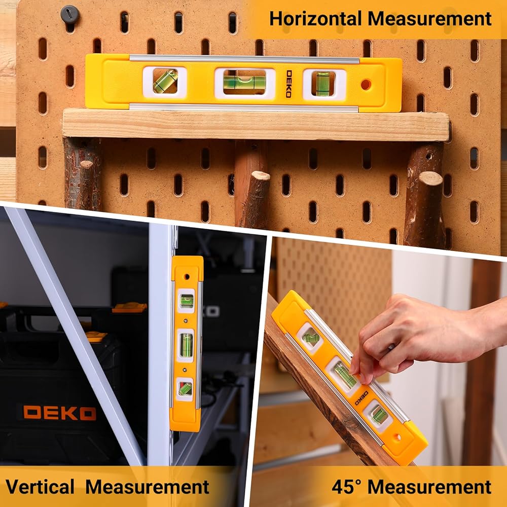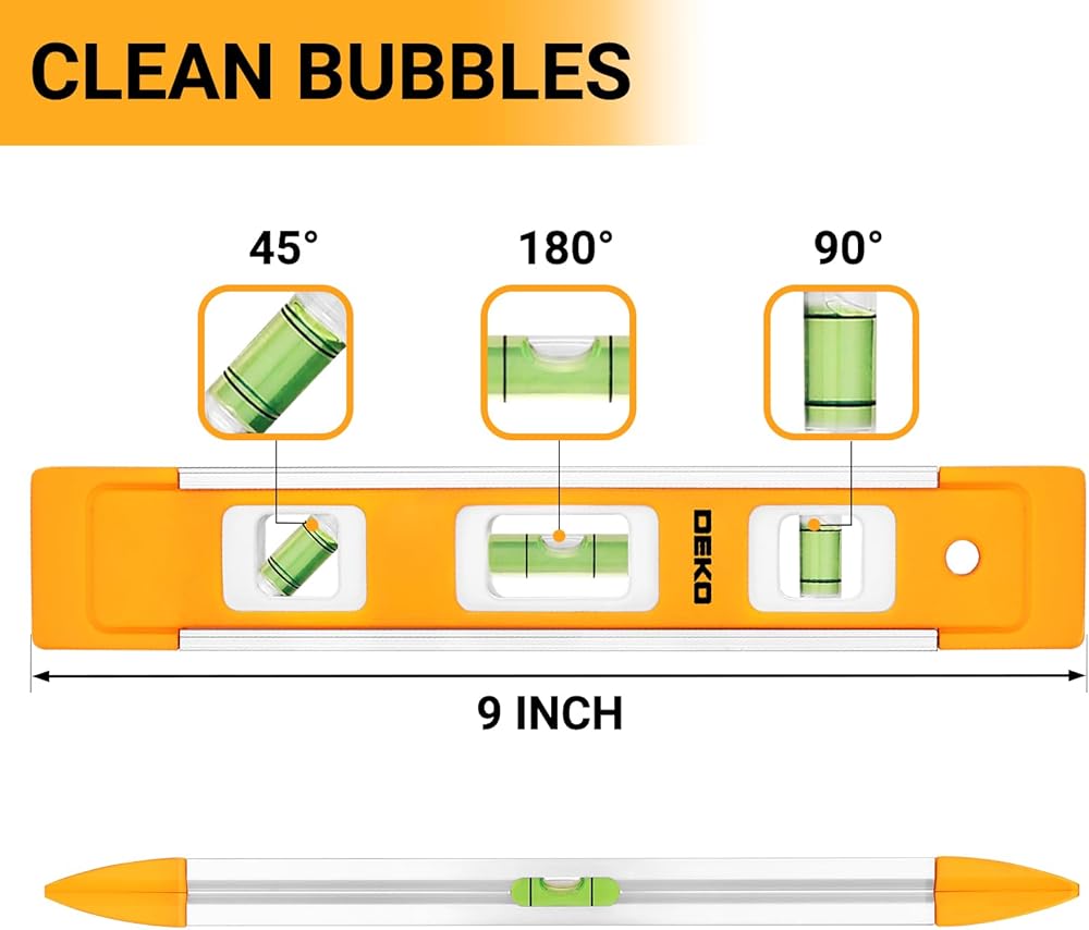 🏆 [خيارات قياس متعددة]: مزود بـ 3 فقاعات مختلفة عند 45 درجة و90 درجة و180 درجة، يوفر هذا المستوى قياسات دقيقة لمختلف التطبيقات.