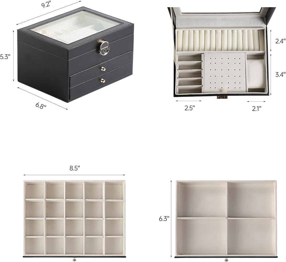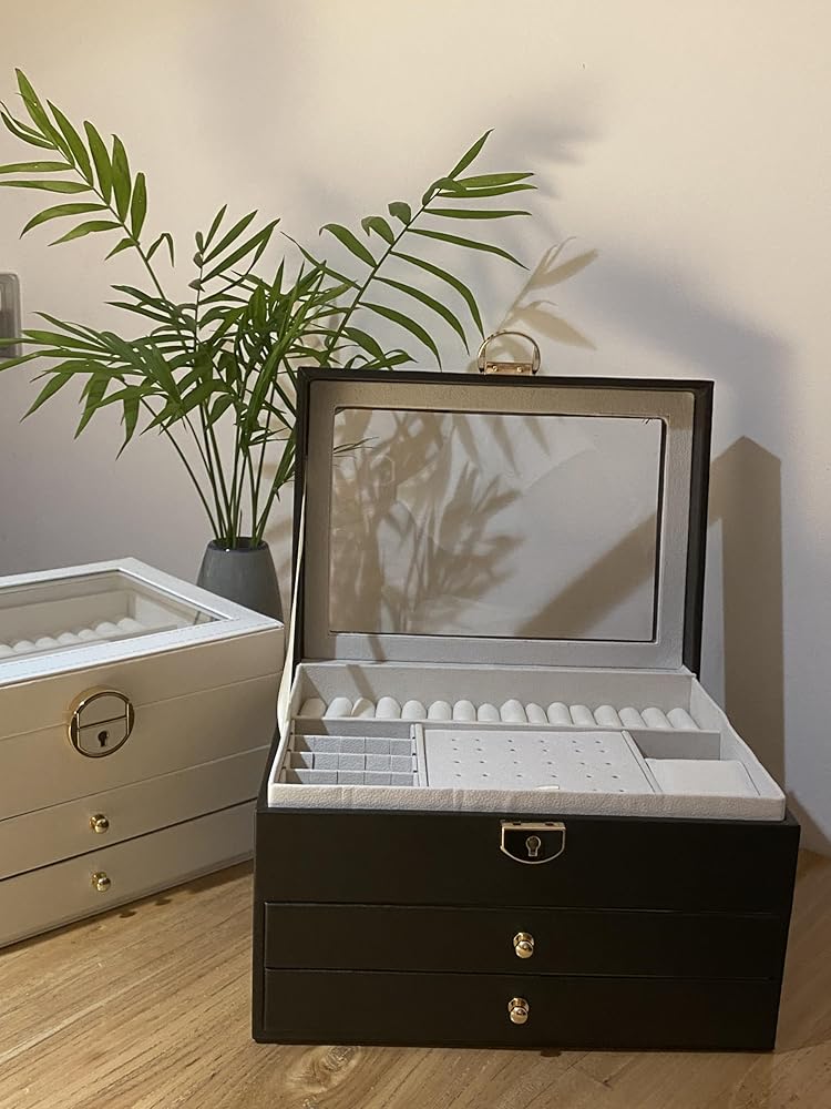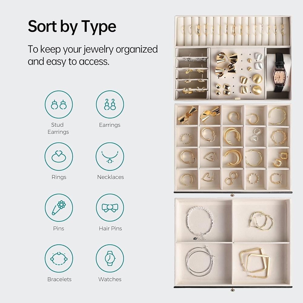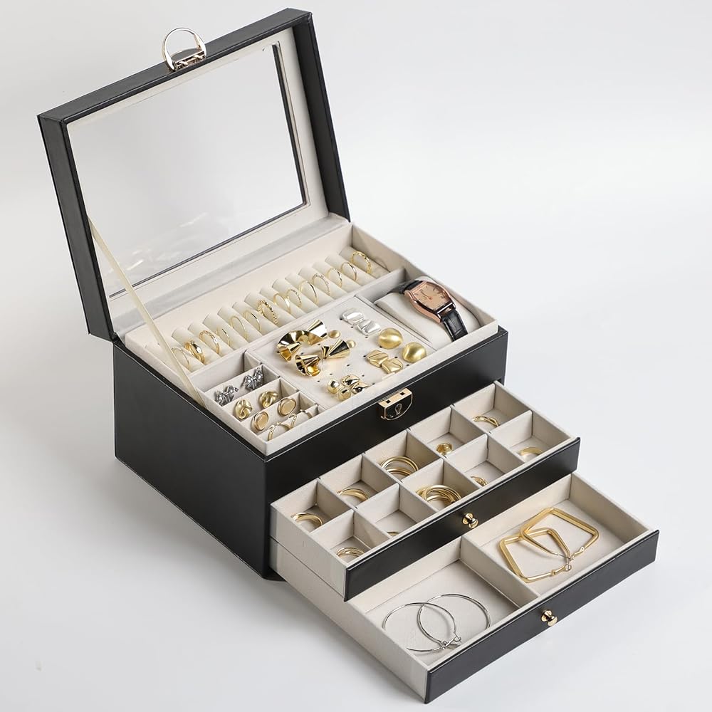 [تخزين، 3 طبقات] احتفظ بجميع مجوهراتك منظمة في صندوق المجوهرات هذا - تدخل قطع المجوهرات الصغيرة في الفتحات المختلفة للطبقة العلوية، وتوضع المجوهرات الكبيرة في الدرجين السفليين.
