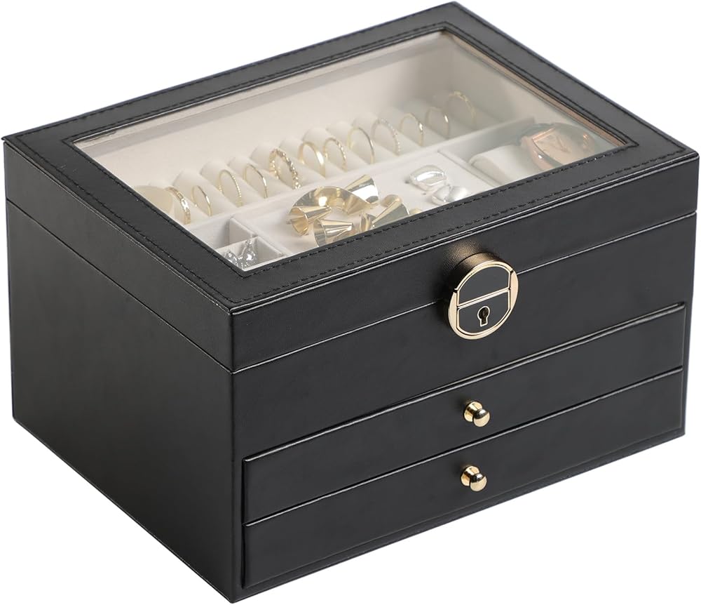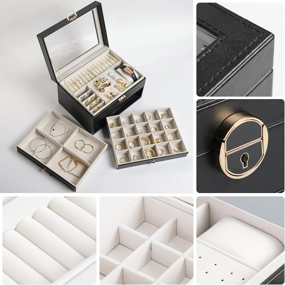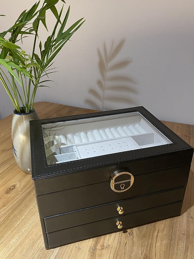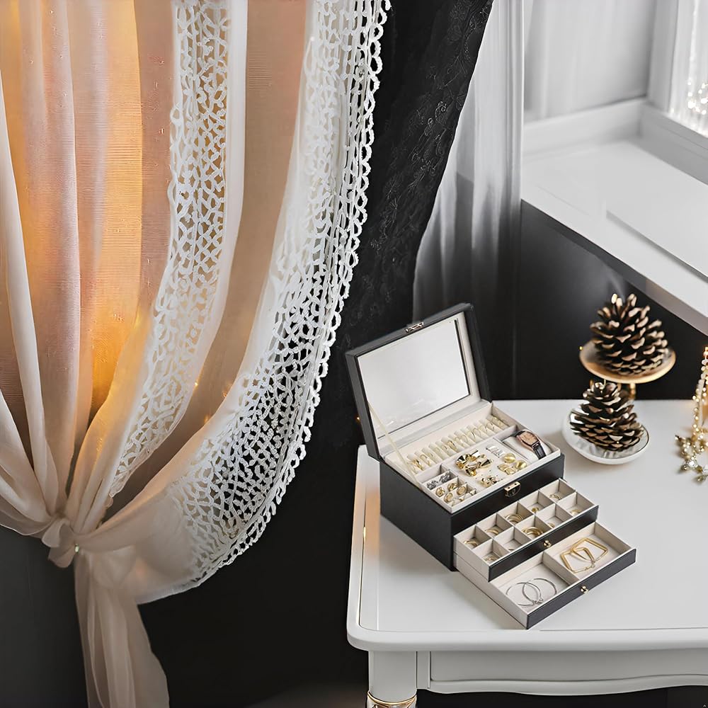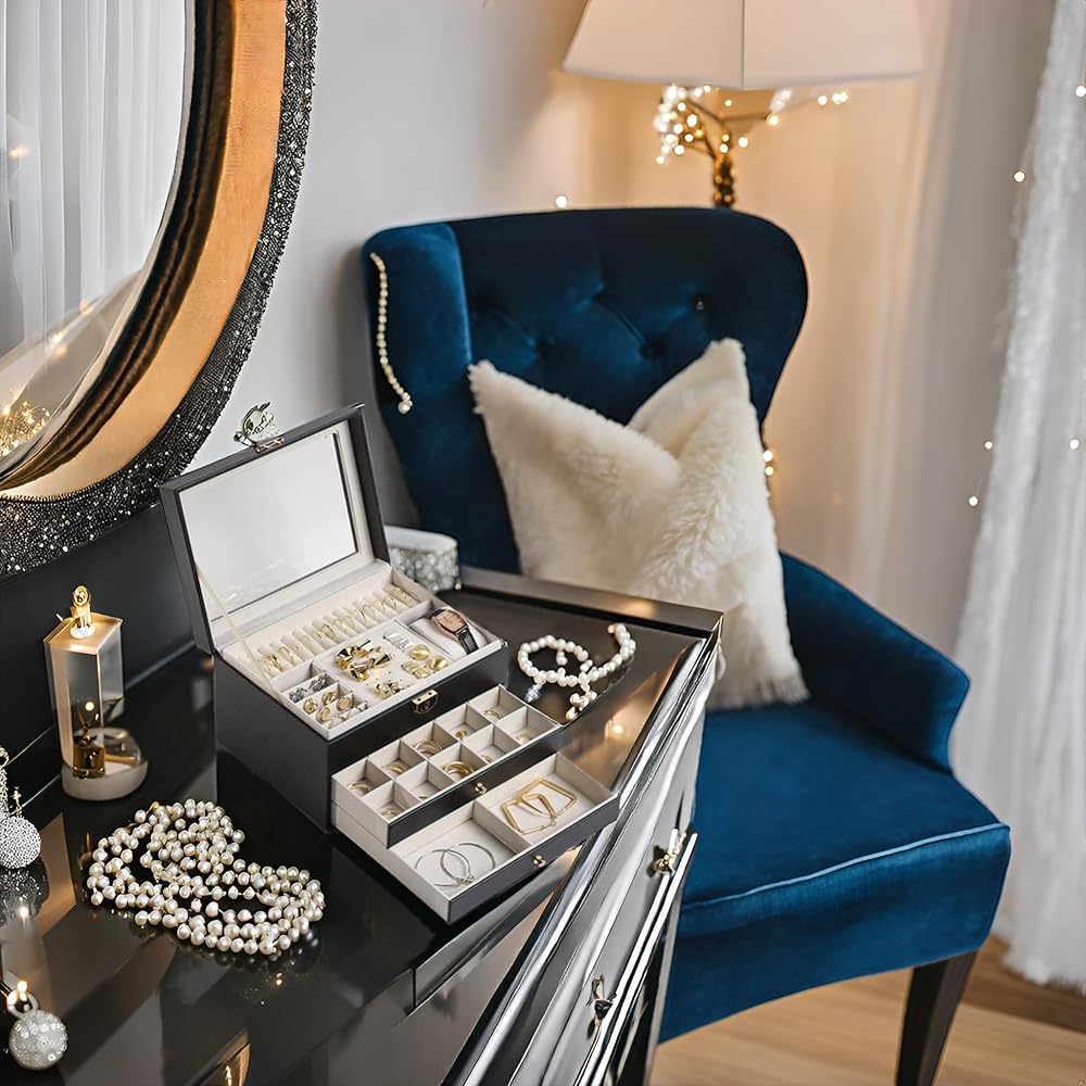 [تخزين، 3 طبقات] احتفظ بجميع مجوهراتك منظمة في صندوق المجوهرات هذا - تدخل قطع المجوهرات الصغيرة في الفتحات المختلفة للطبقة العلوية، وتوضع المجوهرات الكبيرة في الدرجين السفليين.