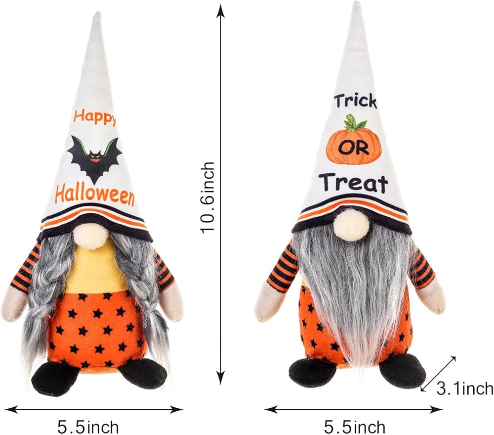 • 【قطعتان من التماثيل للهالوين】التماثيل هي ألوان الهالوين - الأسود والأبيض والبرتقالي. ملابس التماثيل برتقالية واللحية رمادية. القبعة بيضاء. القبعة عليها نقش اليقطين، مكتوب عليها عبارة "خدعة أو حلوى". القبعة الأخرى عليها نمط خفاش ومكتوب عليها "هالوين سعيد"