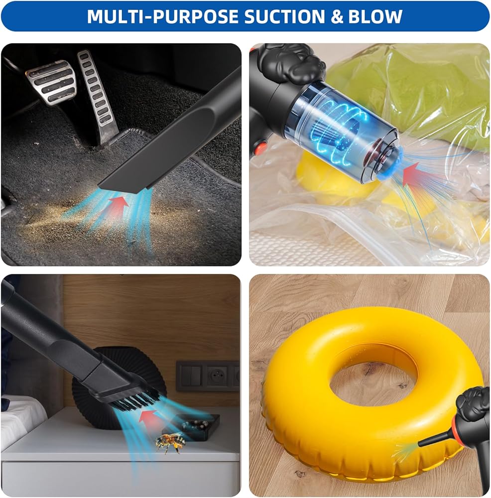2-in-1 Functionality: Combines powerful suction and blower functions, perfect for cleaning dust, debris, pet hair, and inflating air mattresses and pool toys.