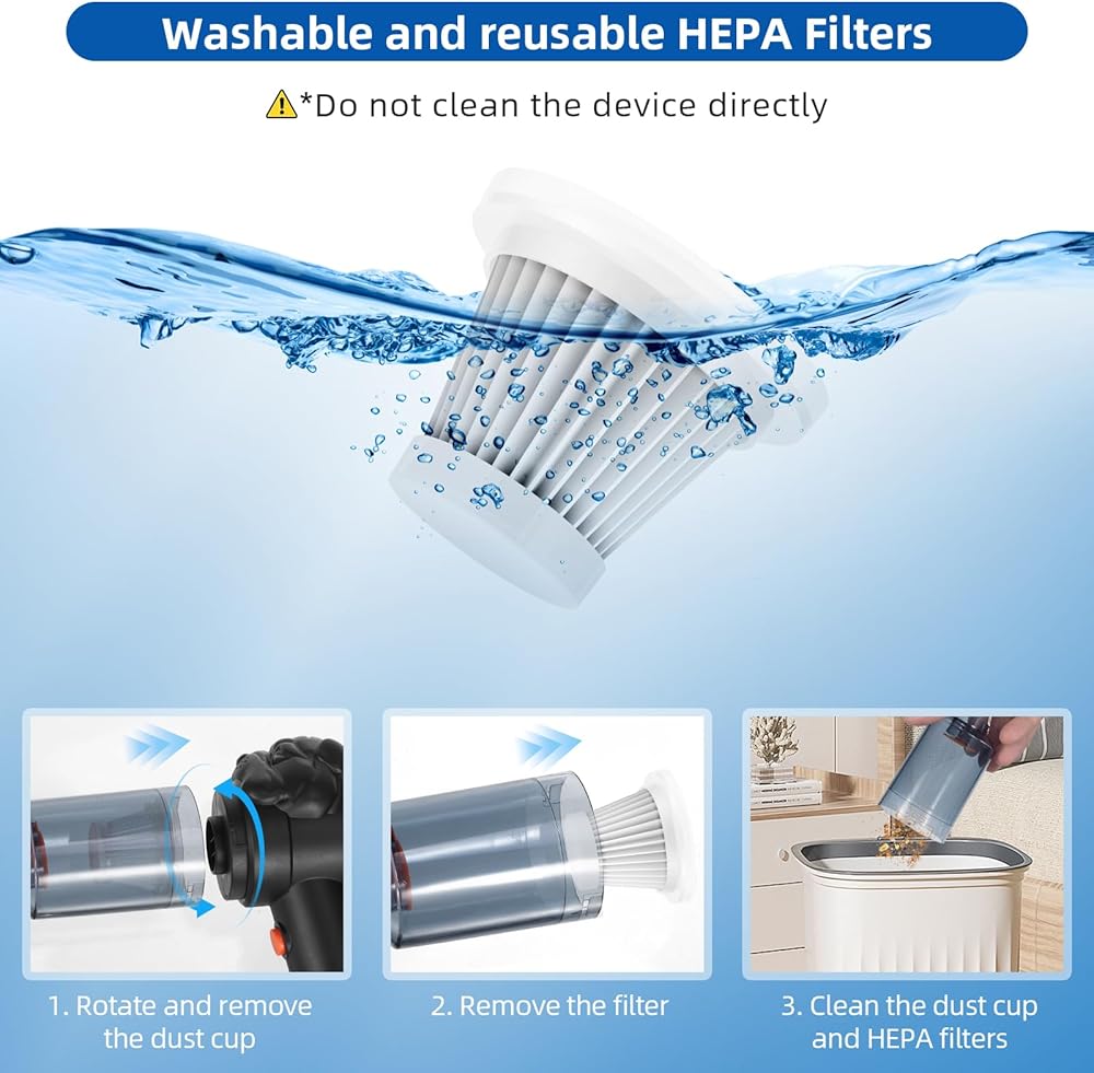 • Reusable HEPA Filter: The handheld vacuum cordless rechargeable model includes a removable and washable HEPA filter. This HEPA filter absorb tiny particles, ensuring the best cleaning strength. Maintain optimal cleaning efficiency with this vacuum cleaner for car and home, designed for sustainability