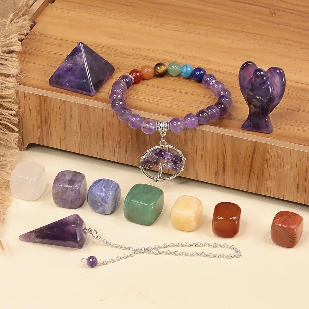 علاج كريستالي - تشتمل المجموعة على 7 قطع من أحجار الشاكرا (الجمشت، الكوارتز الصخري، السوداليت، الأفينتورين الأخضر، اليشم الأصفر، العقيق، اليشب الأحمر)، قطعة واحدة من الهرم الكريستالي، قطعة واحدة من السوار المرن، قطعة واحدة من البندول، قطعة واحدة من ملاك الجيب؛ مثالية لهواة جمع المعادن، وأيضًا كرة فنغشوي السحرية القوية للعرض. حتى أنها يمكن استخدامها بمثابة ثقالة ورق، أو تميمة، أو غلاف كتاب صغير.
