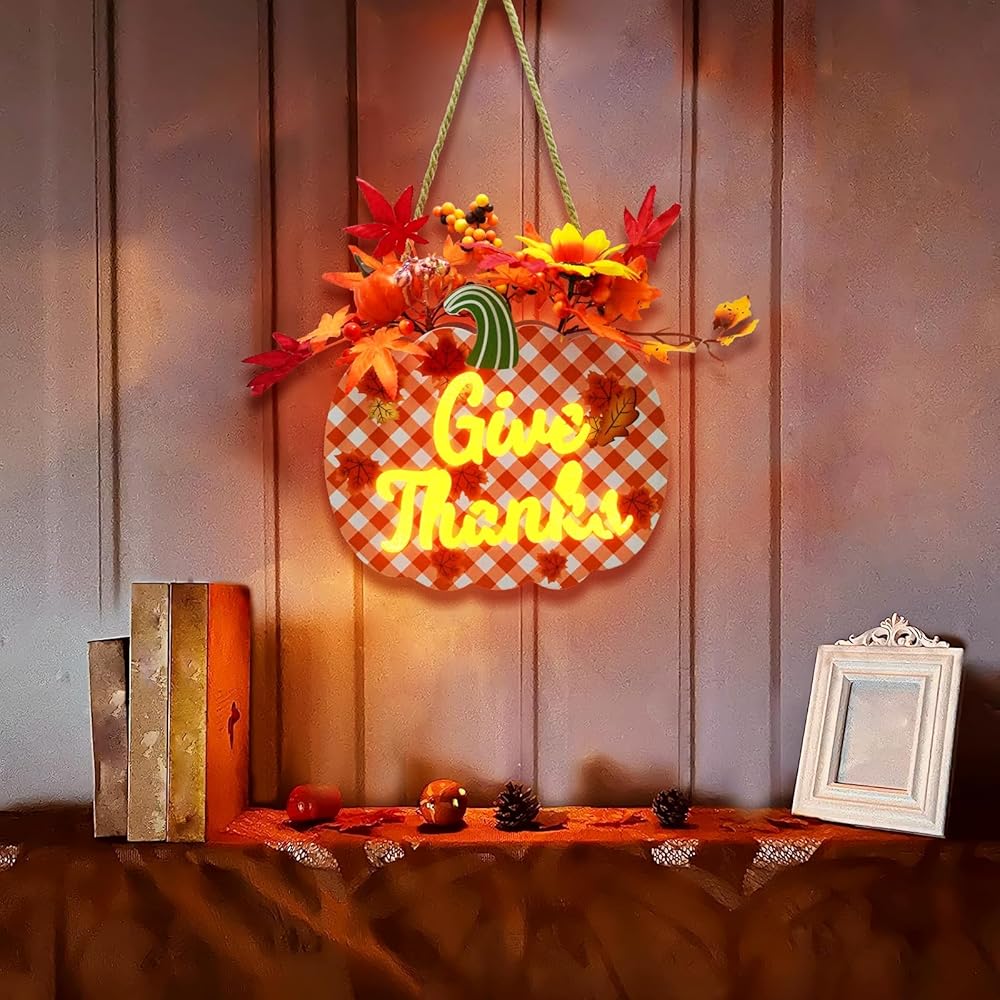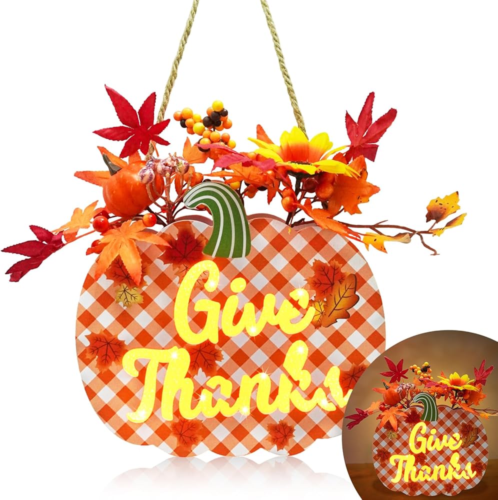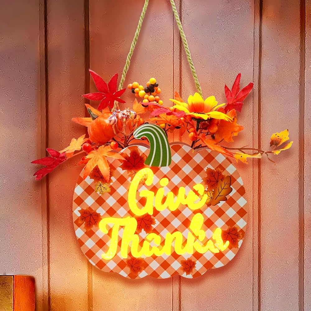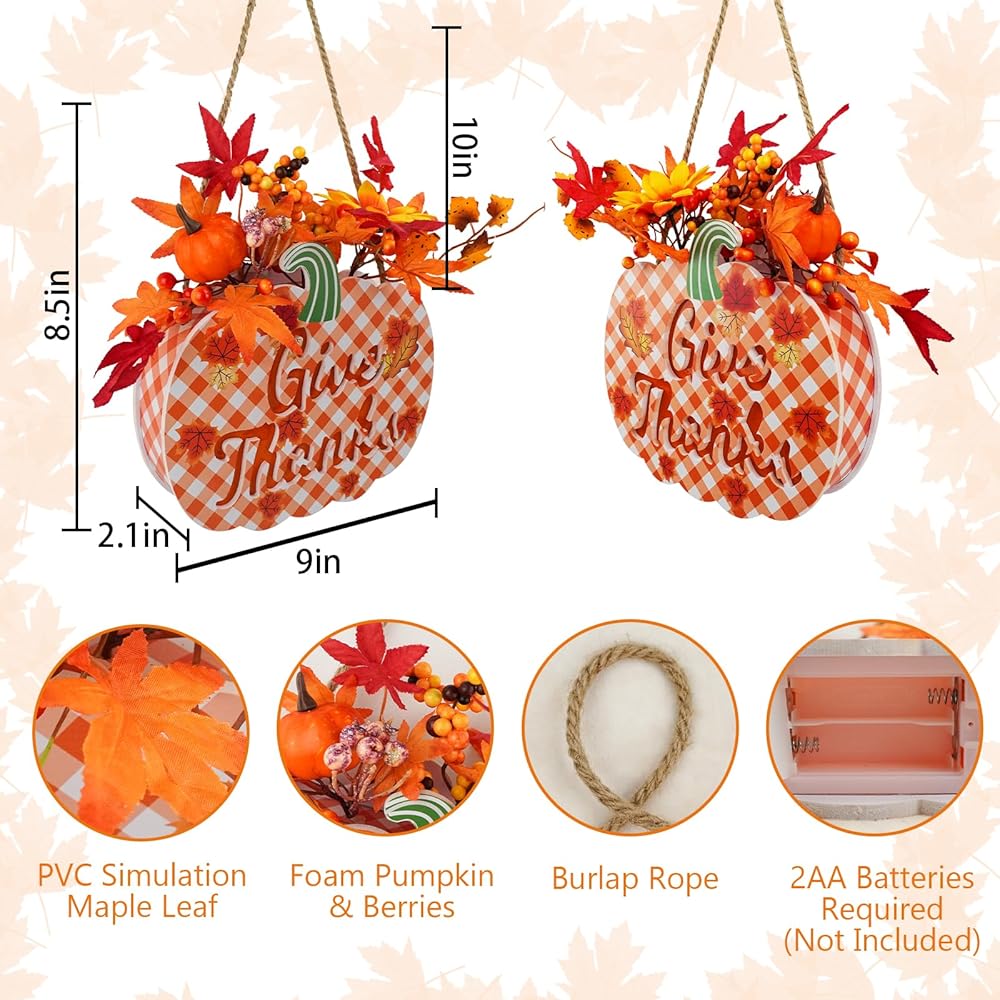 مضاءة عيد الشكر اليقطين علامة اكليلا من الزهور لديكور الباب الأمامي، وإعطاء الشكر سقوط علامة معلقة تعمل بالبطارية أوراق القيقب التوت باب علامة الشكر الجدول محور سقوط الديكور
