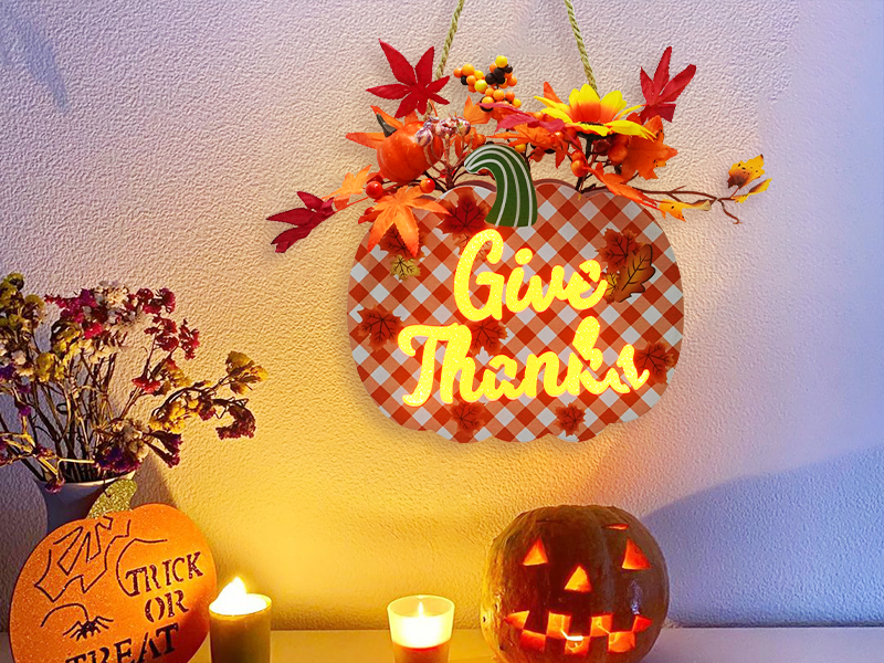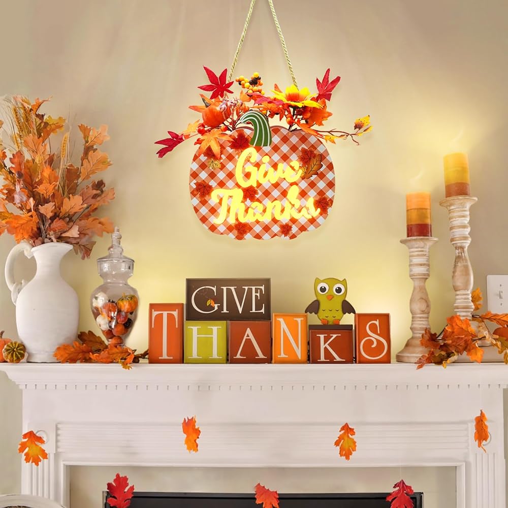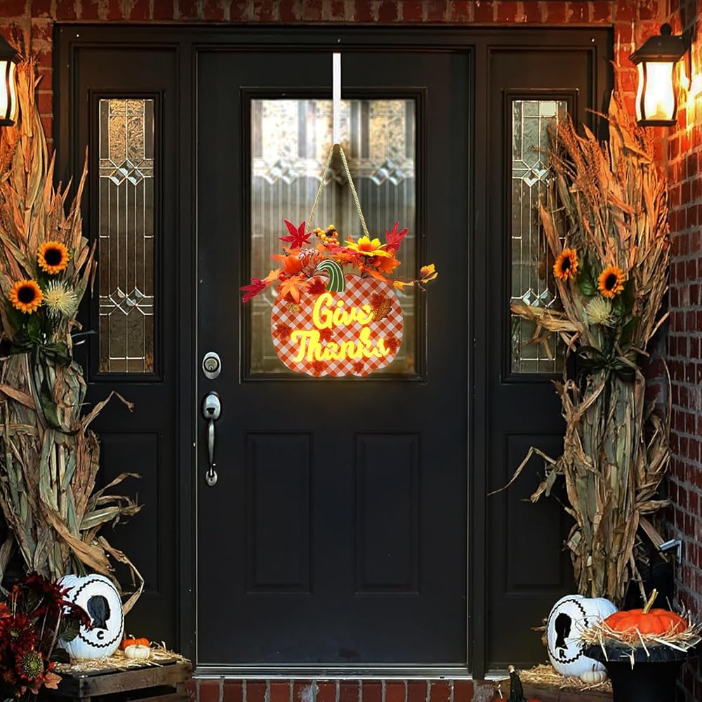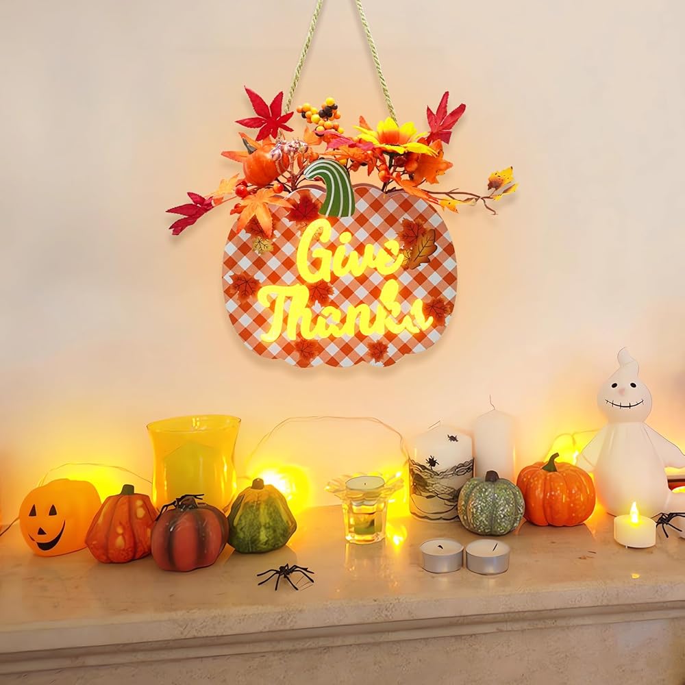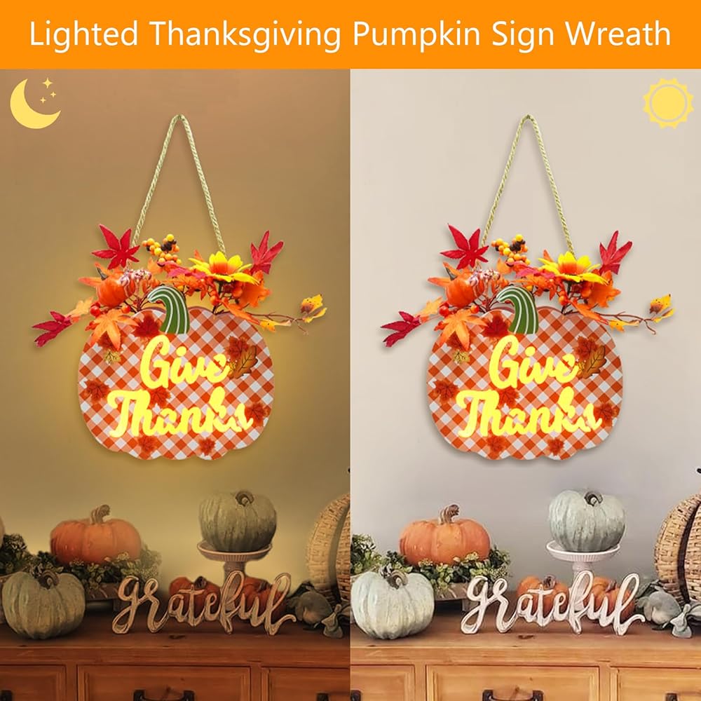 مضاءة عيد الشكر اليقطين علامة اكليلا من الزهور لديكور الباب الأمامي، وإعطاء الشكر سقوط علامة معلقة تعمل بالبطارية أوراق القيقب التوت باب علامة الشكر الجدول محور سقوط الديكور