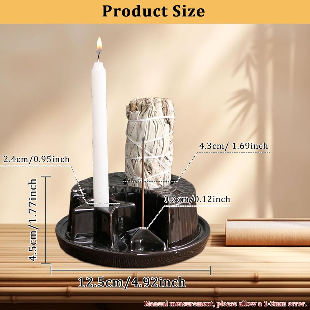 • لوحة قاعدة ذات حجم كافٍ، حجم لوحة القاعدة حوالي 12.5 سم/4.92 بوصة، والتي يمكنها جمع الرماد بشكل مثالي من الشموع المحترقة وعصي البخور والمريمية، لذلك لا داعي للقلق بشأن اتساخ سطح الطاولة أثناء الإضاءة. البخور.