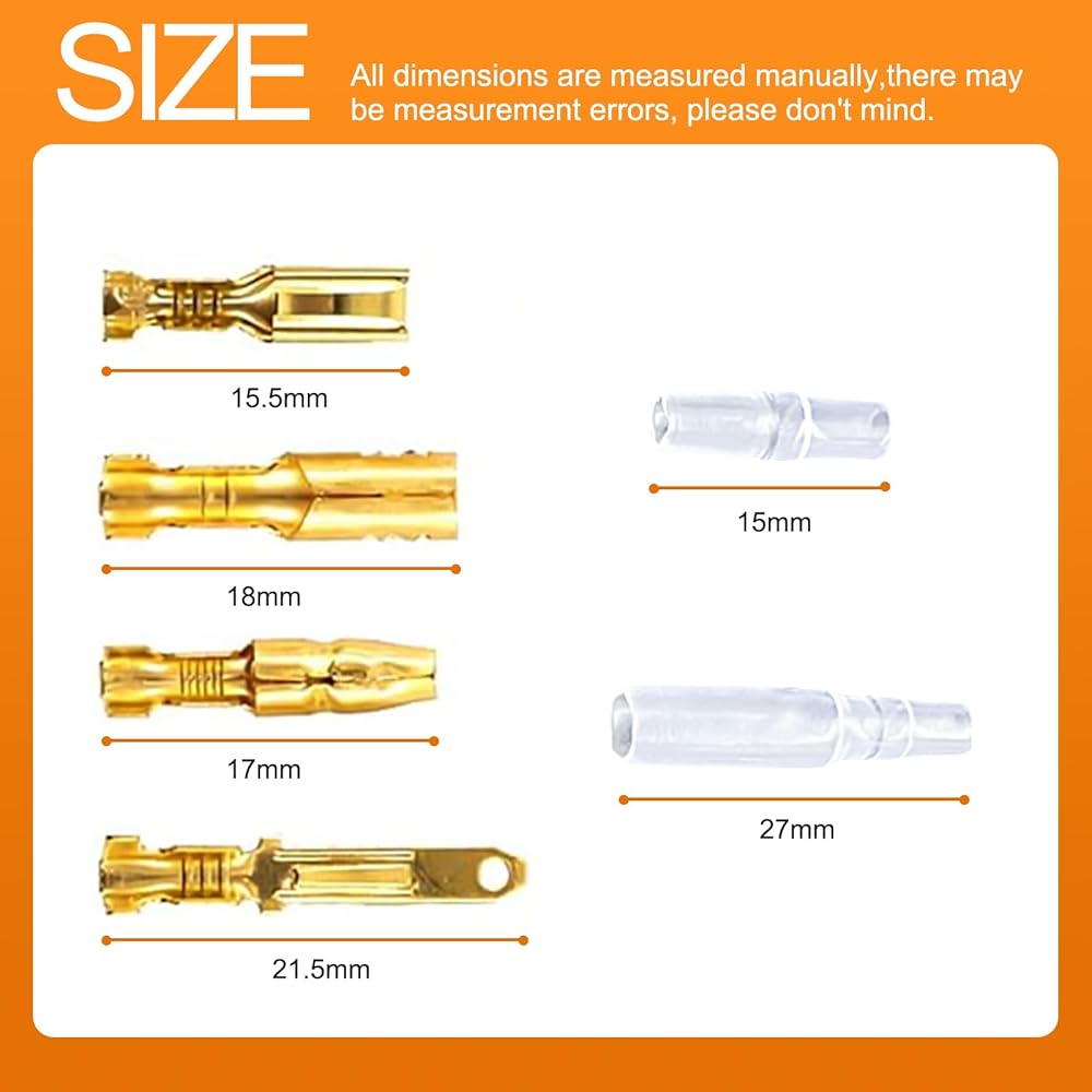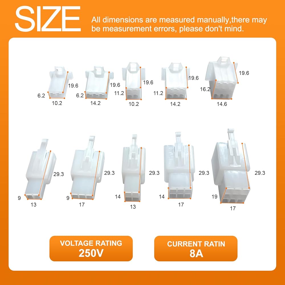 • Automotive Electrical Wire Connector Kit: includes total 700 pcs connectors terminals in the package to meet your various requriements. Male terminal 240pcs, female terminal 240pcs, 2 pin way connector 10kits, 3 pin way connector 10kits, 4 pin way connector 10kits, 6 pin way connectors 10 kits, 9 pin way connector 10 kits, 4mm bullet terminal 30kits, 4mm bullet terminal cover 30kits.