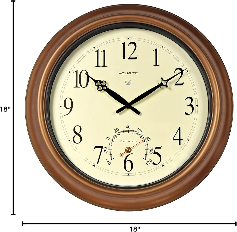 A stately wall clock for indoors and out, this 18-inch copper clock from Chaney Instruments dresses up any living room, patio or porch. A weather-resistant copper finish and solid metal construction ensure years of outdoor use. The Atomic Clock sets itself automatically for perfect time-even for Daylight Savings Time switches. A Fahrenheit thermometer on the dial face is easy to read without obfuscating the time. Energy-efficient, the clock runs for up to two years on one AA battery. Handsome Arabic numerals with black graphics on an off-white backing and unique hands make this clock a classy addition to the pool area or sunroom. The thermometer range is -40 to 120 degrees F.