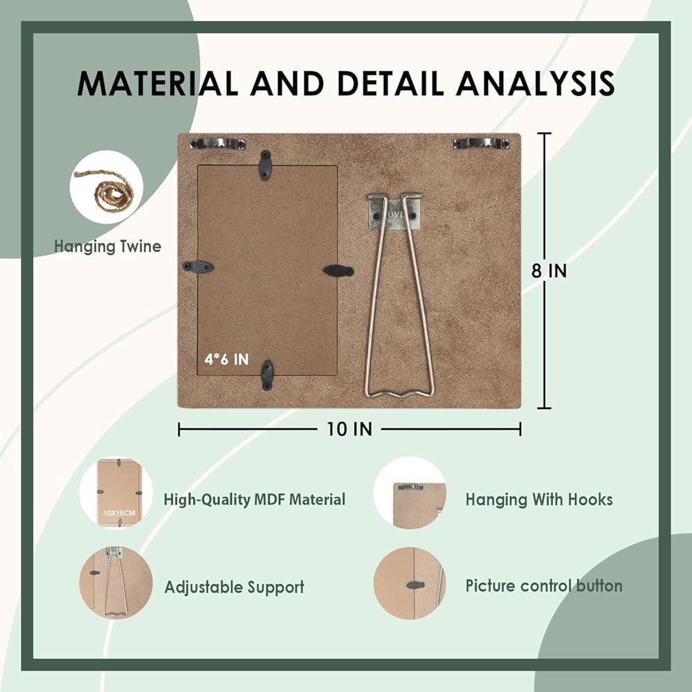 Introducing our meticulously crafted Picture Frame, designed to beautifully display your cherished memories with sophistication and style. With dimensions of 9.8 x 7.9 inches, this frame is precisely tailored to accommodate 4” x 6” photos. Constructed from premium MDF wood, this frame boasts exceptional durability and longevity. Versatile in design, it seamlessly enhances the ambiance of any space, whether it's your living room, bedroom, or office. This picture frame is an excellent choice for birthdays, weddings, anniversaries, and other special occasions, allowing your loved ones to treasure their memories forever. Whether you have questions or concerns, we're here to assist you every step of the way. Elevate your space and preserve your memories in style with our meticulously crafted Picture Frame. Order now and experience the difference!