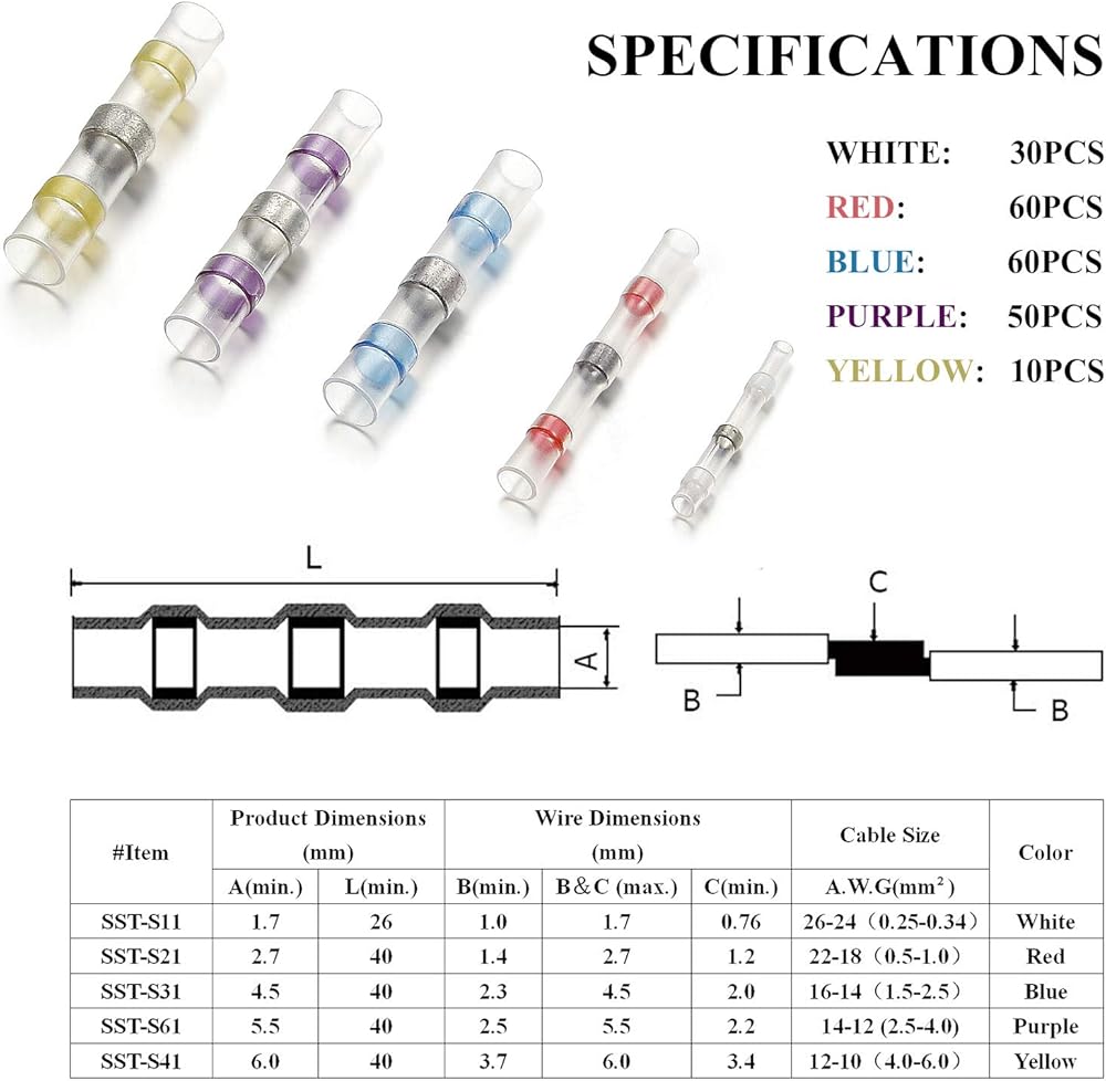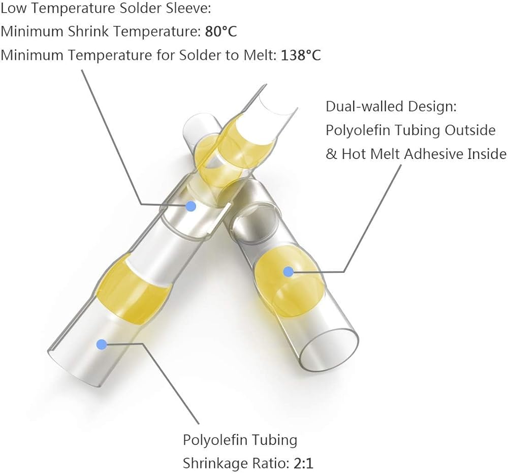 • FAST & EASY APPLICATION: All it takes is a heat gun to control the temperature and connect the wires even in a confined space. No crimping required, making it easier and more efficient compared to standard solder heat shrink butt connectors.