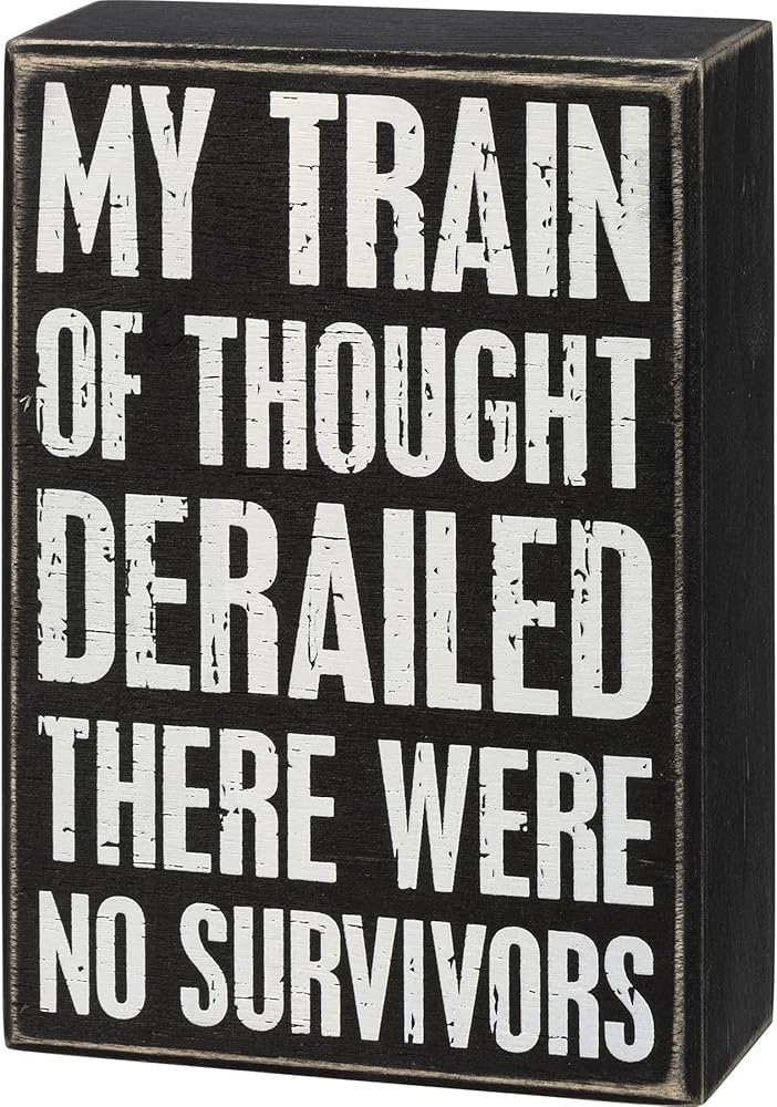A classic black and white wooden box sign featuring a distressed "My Train Of Thought Derailed There Were No Survivors" sentiment. Easy to hang or can free-stand alone.