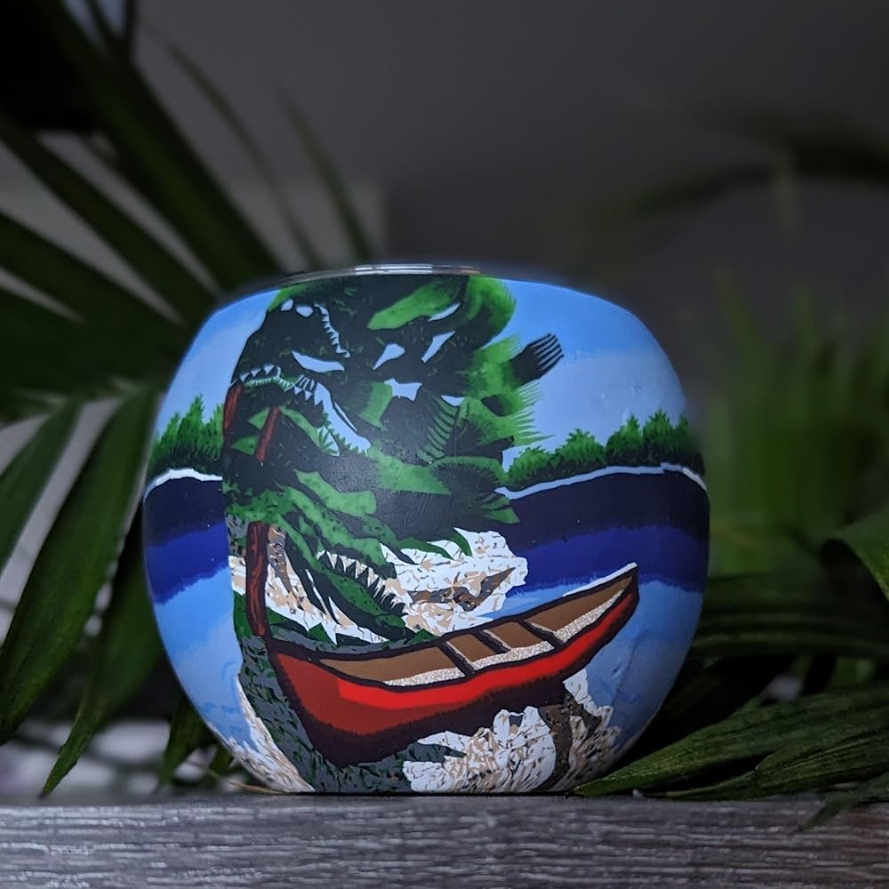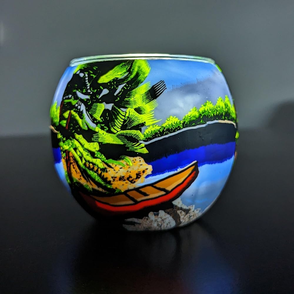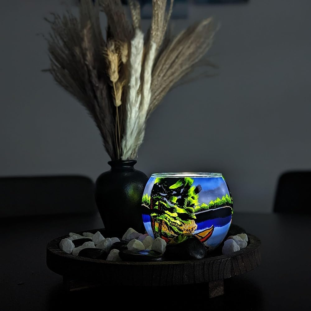 Bring the enchanting beauty of the Northern Lights into your home with our Handcrafted Glass Candle Holder. This exquisite piece features a mesmerizing aurora borealis design, making it an ideal addition to your wedding table decor, centerpieces, or any room that needs a touch of elegance. Crafted from high-quality glass, this candle holder is not only durable but also a stunning work of art. With dimensions of 4.33 inches in width and 3.93 inches in height, it is perfectly suited for tealight candles, providing a warm and inviting glow. Whether you're decorating for a special occasion or searching for the perfect gift, this glass candle holder is an excellent choice. Its unique design and premium craftsmanship ensure it will be a cherished part of your decor for years to come. Embrace the magic of the Northern Lights with this beautiful and functional piece.